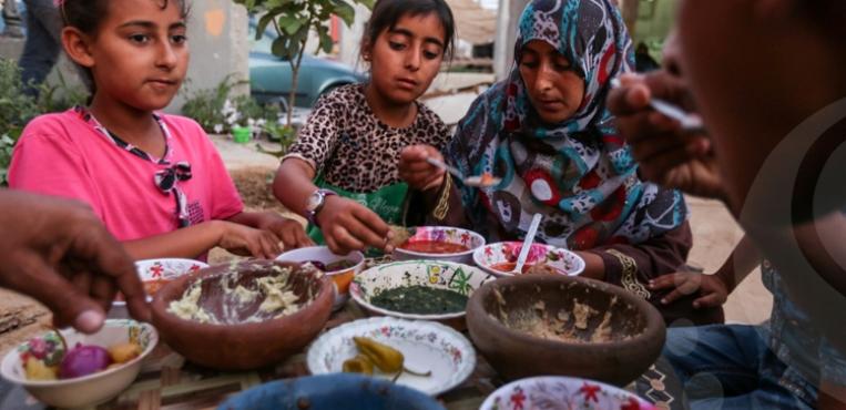 عائلة فلسطينية تتناول طعام الإفطار أمام بيتها المهدم فى خزاعة