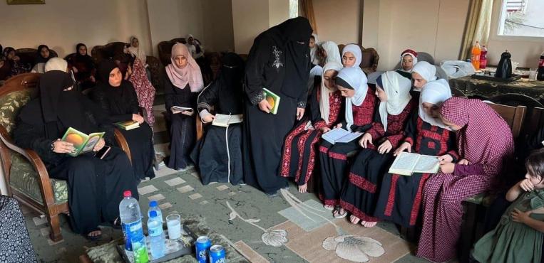 الفلسطينية أمل الشوربجي "55 عاما" تحول منزلها إلى مركز لتحفيظ القرآن الكريم لـ 60 طفلًا مع أمهاتهم وجداتهم في مدينة خانيونس جنوب قطاع غزة.