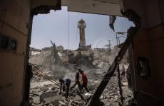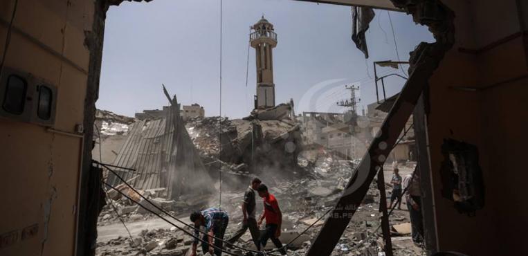 صلاة المواطنين بجانب انقاض مسجد الشهداء بمخيم النصيرات وسط قطاع غزة