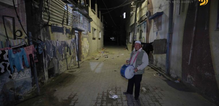 يتجول المسحراتي محمد قطروسً منذ 55 عاماً بين أزقة شوارع المخيم لإيقاظ الناس لتناول سحورهم في شهر رمضان