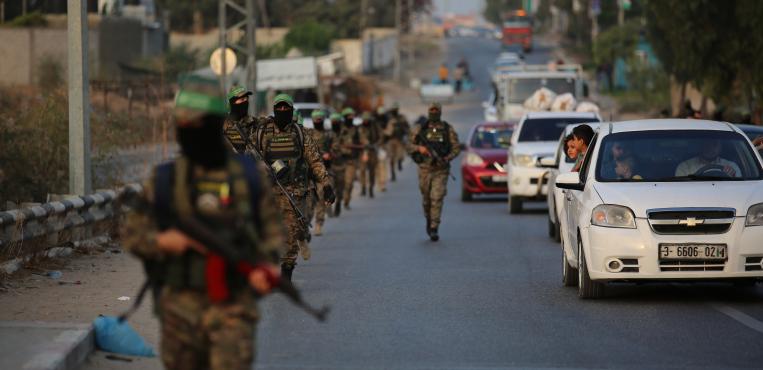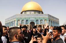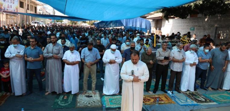 مصلون مسلمون فلسطينيون يؤدون صلاة الجمعة أمام مسجد قبة الصخرة في مجمع المسجد الأقصى بالبلدة القديمة بالقدس 10 أكتوبر 2021