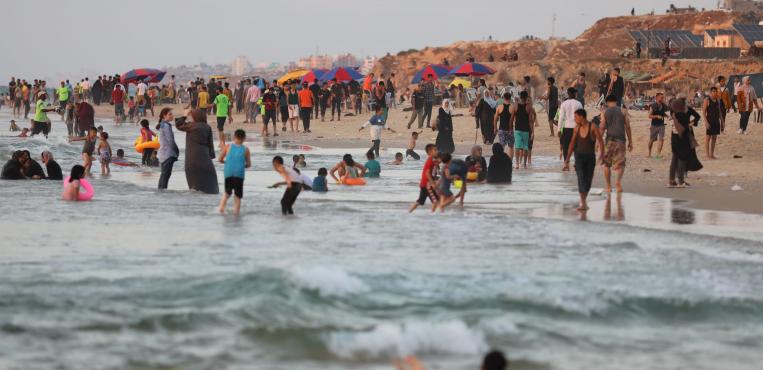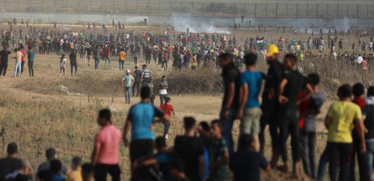 الحشود المشاركة في المسيرة التي دعت إليها القوي الوطنية والإسلامية في قطاع غزة عصر اليوم في مخيم العودة شرق ملكة