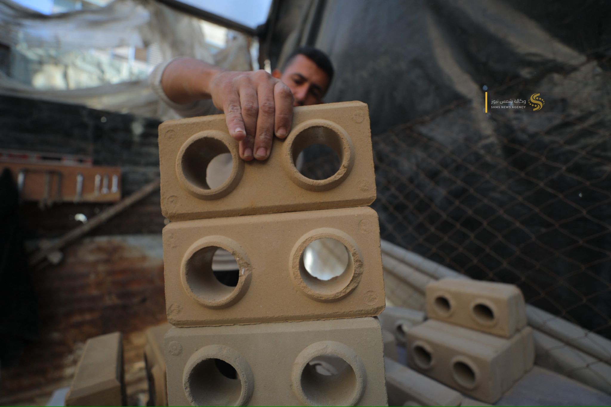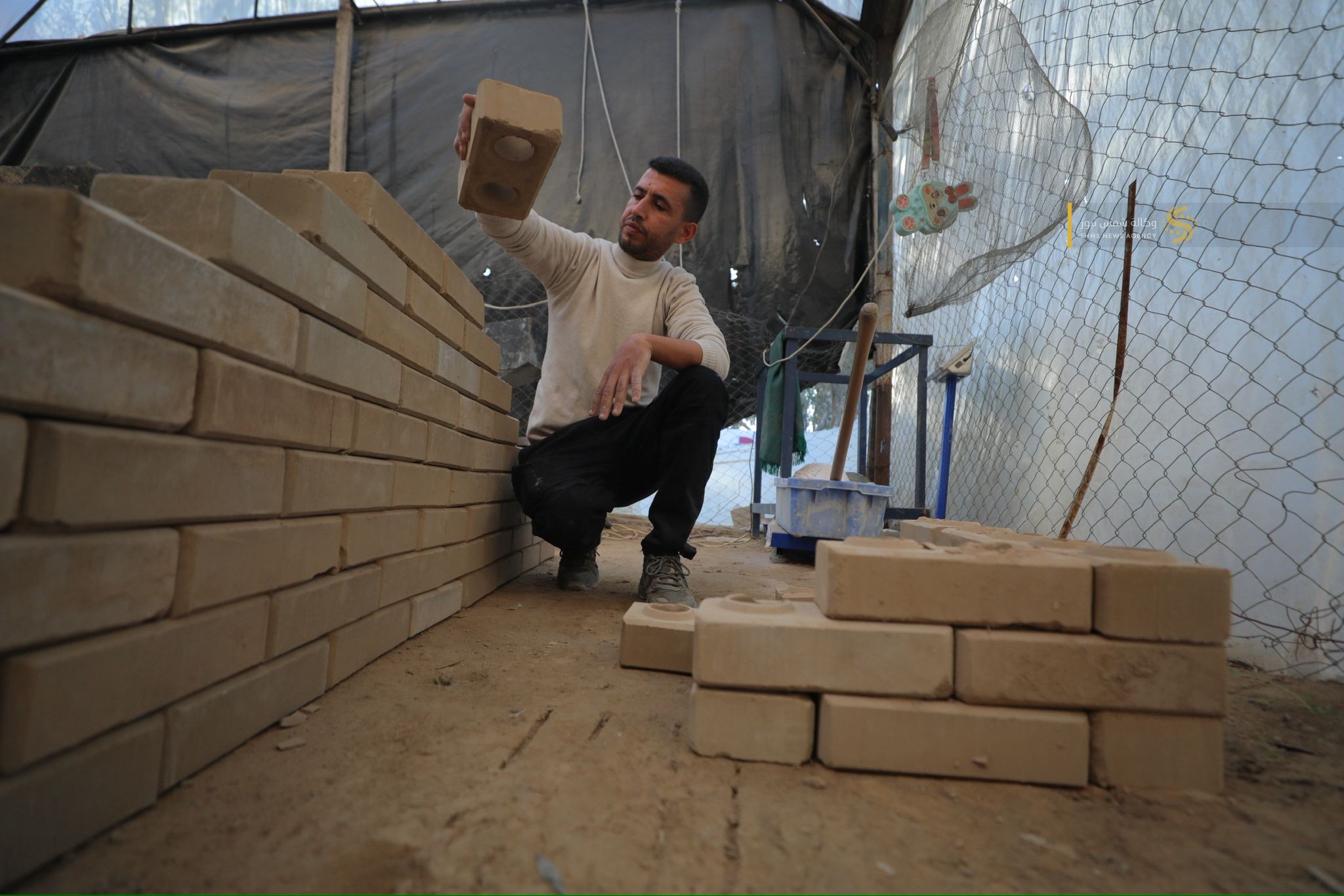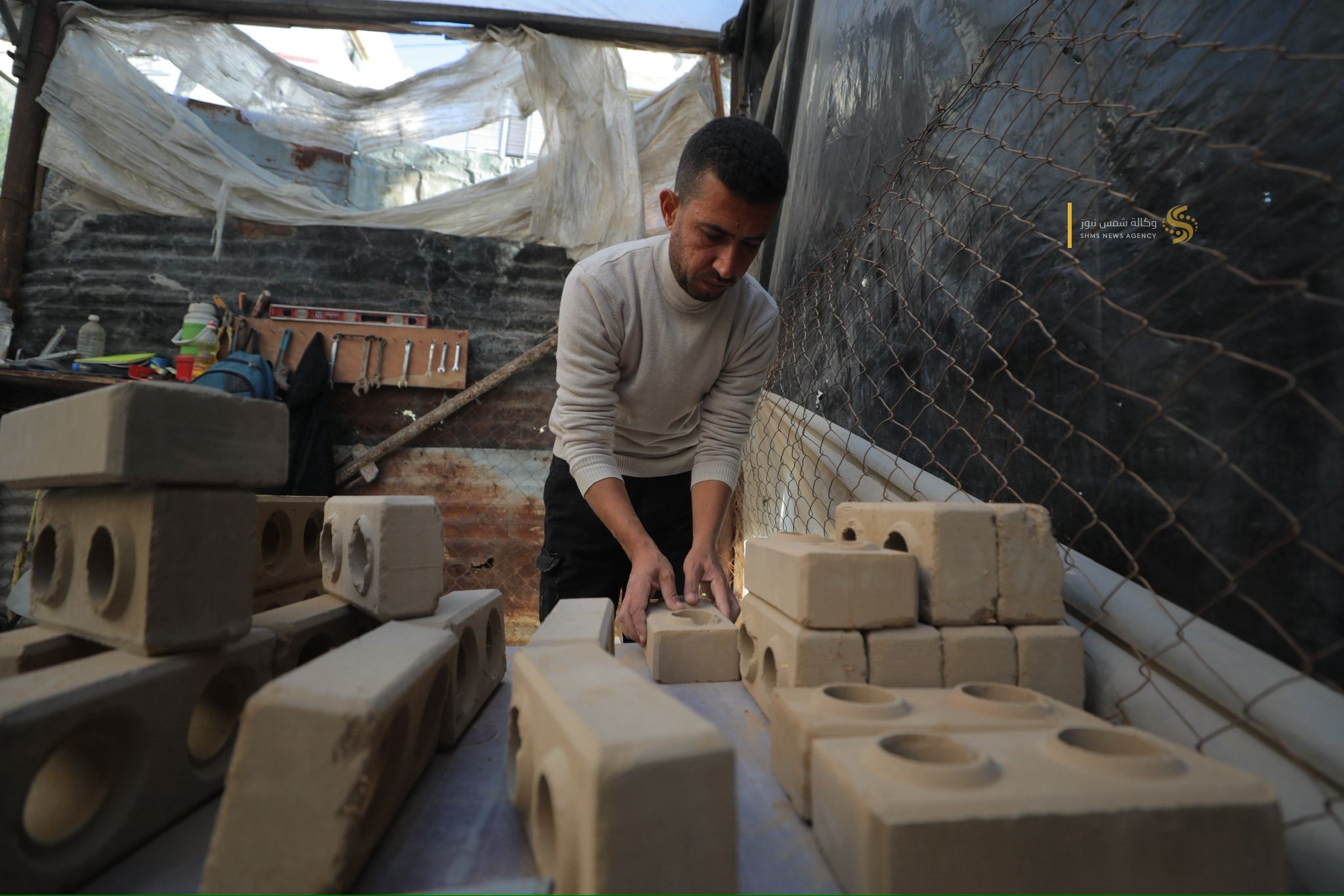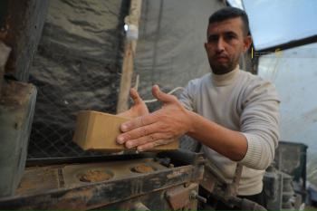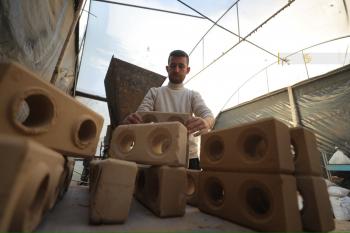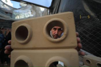 مواطنٌ غزي يُبدع في صناعة الطوب لتخفيف معاناة النازحين