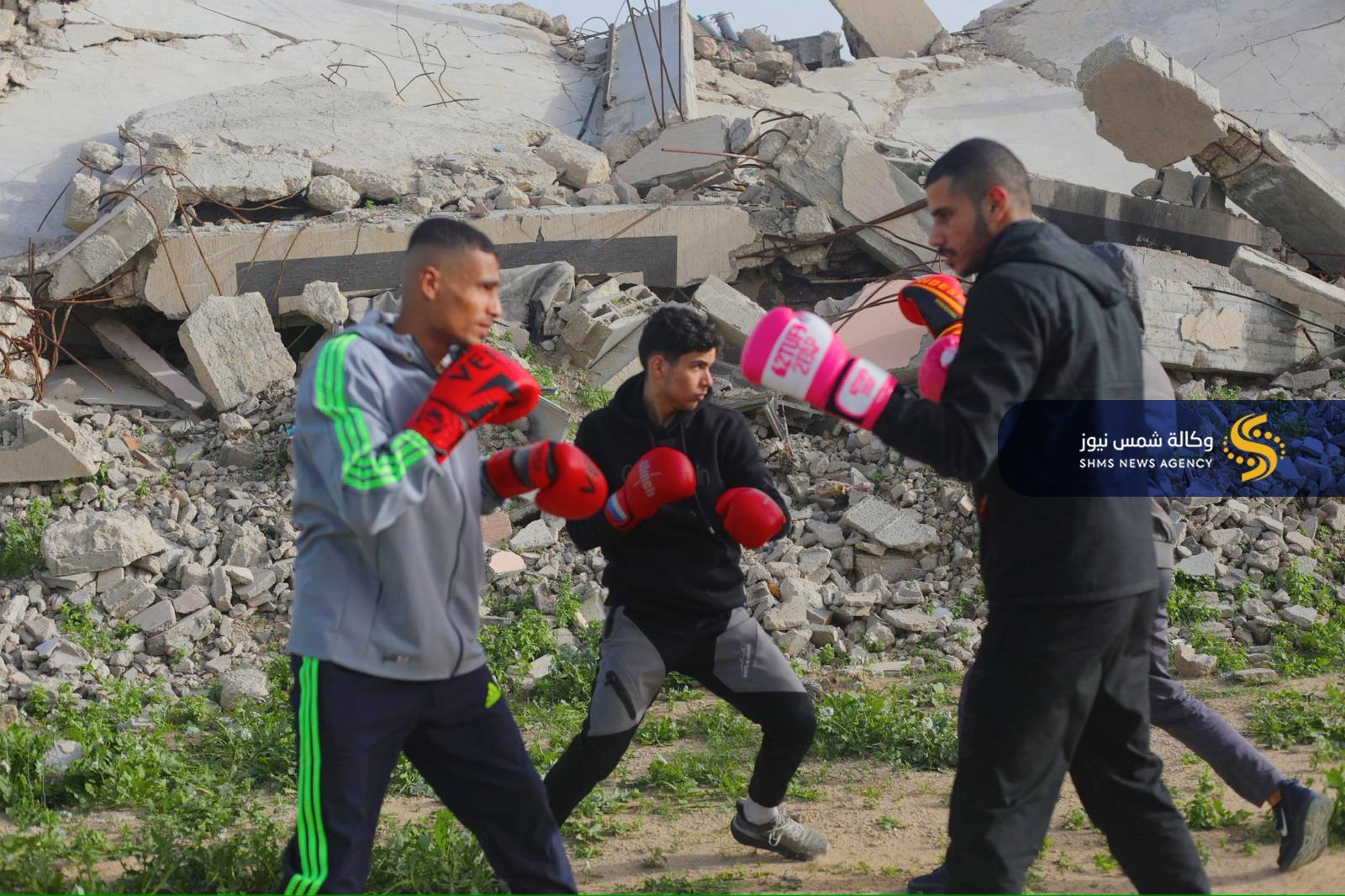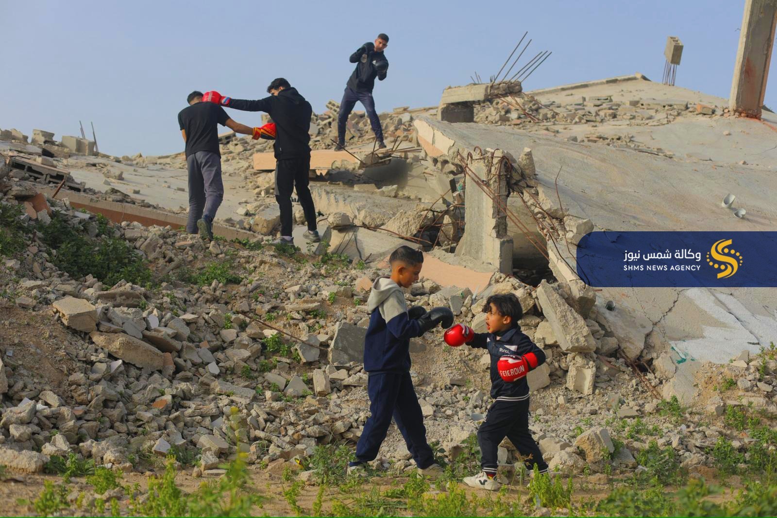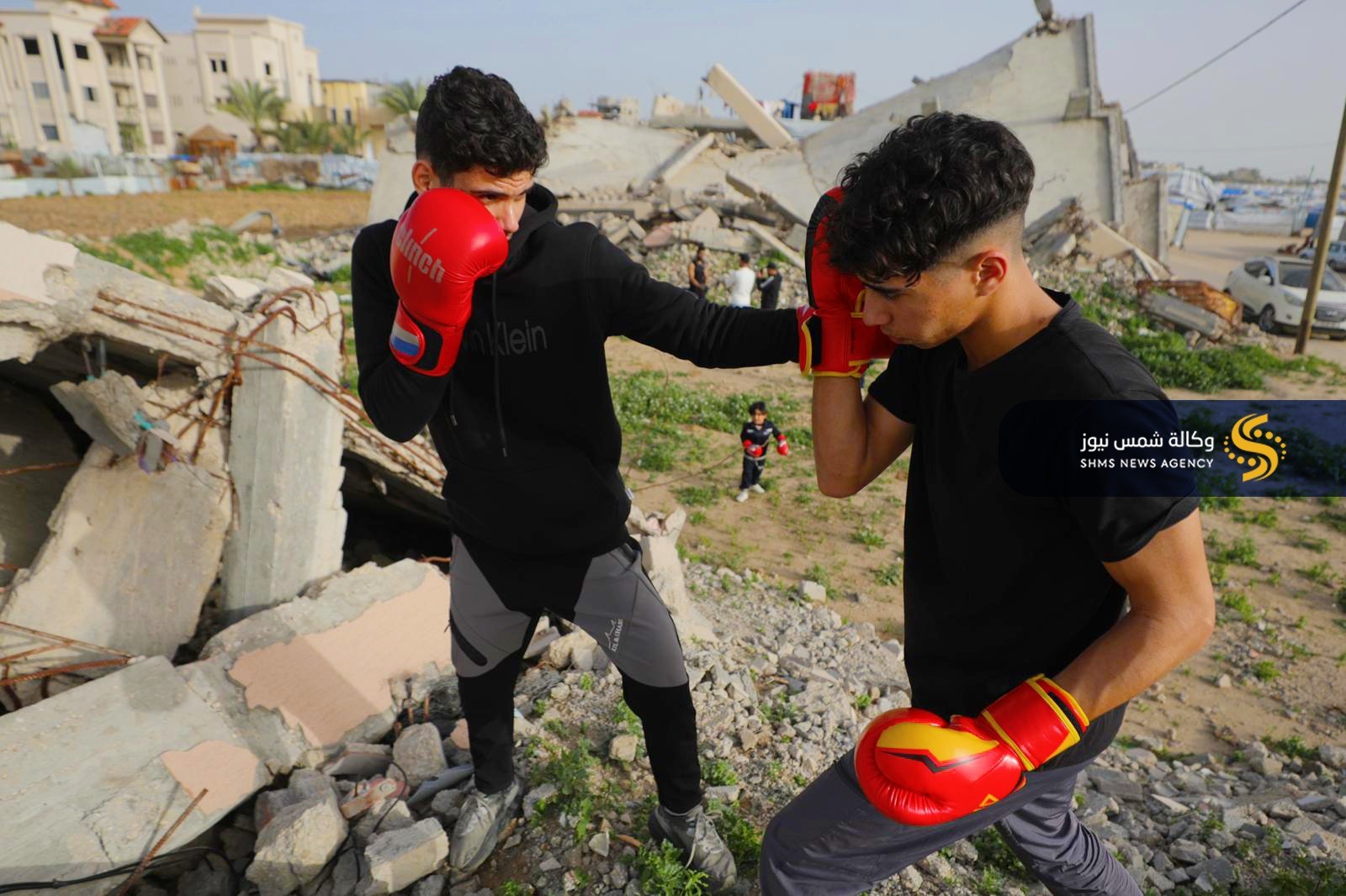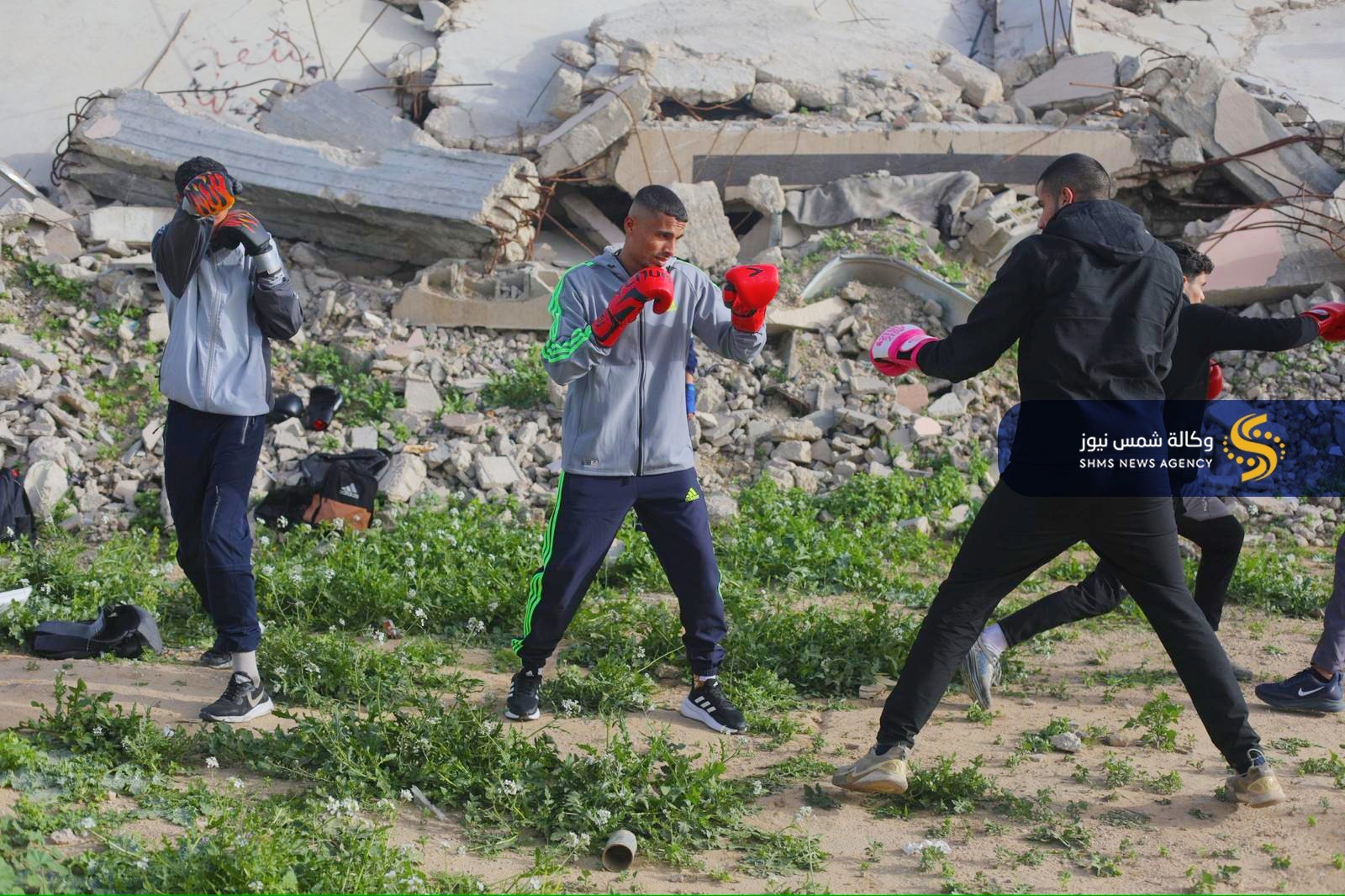 شبان فلسطينيون يمارسون رياضة الملاكمة بين أنقاض المباني المدمّرة في مدينة غزة
