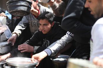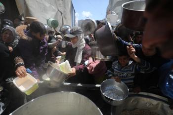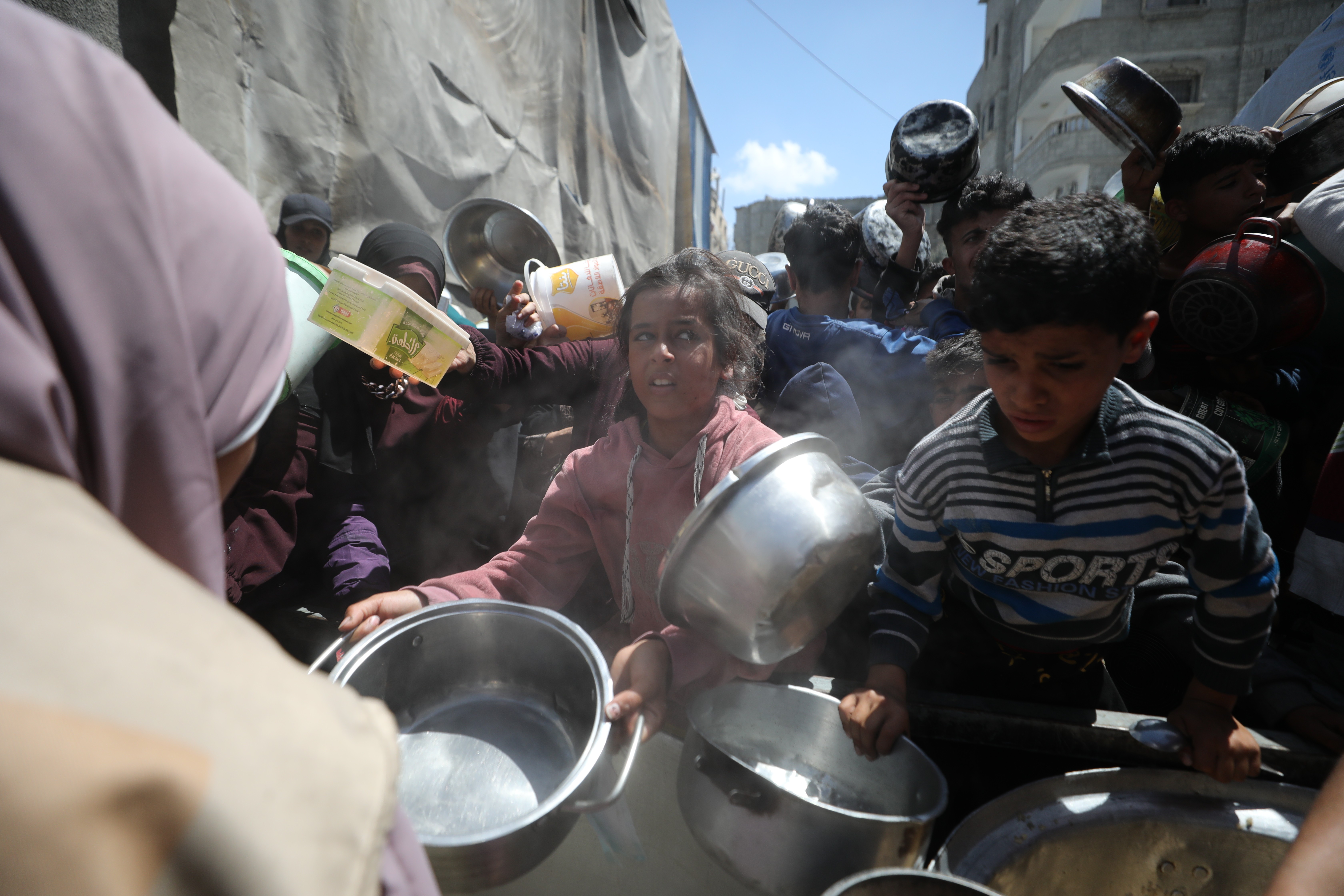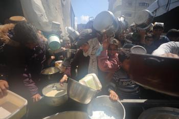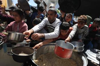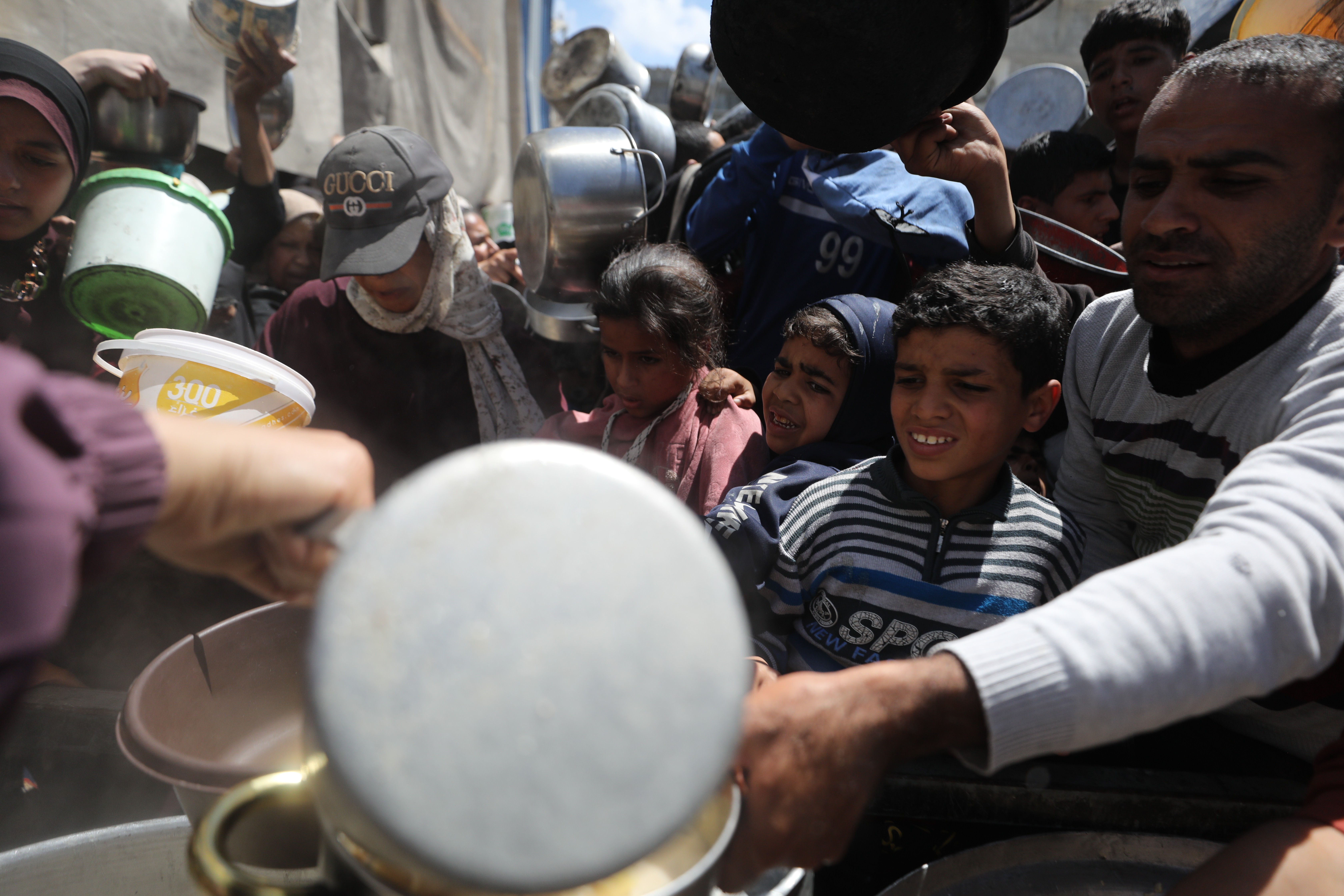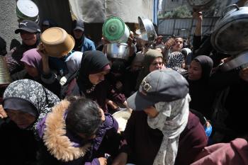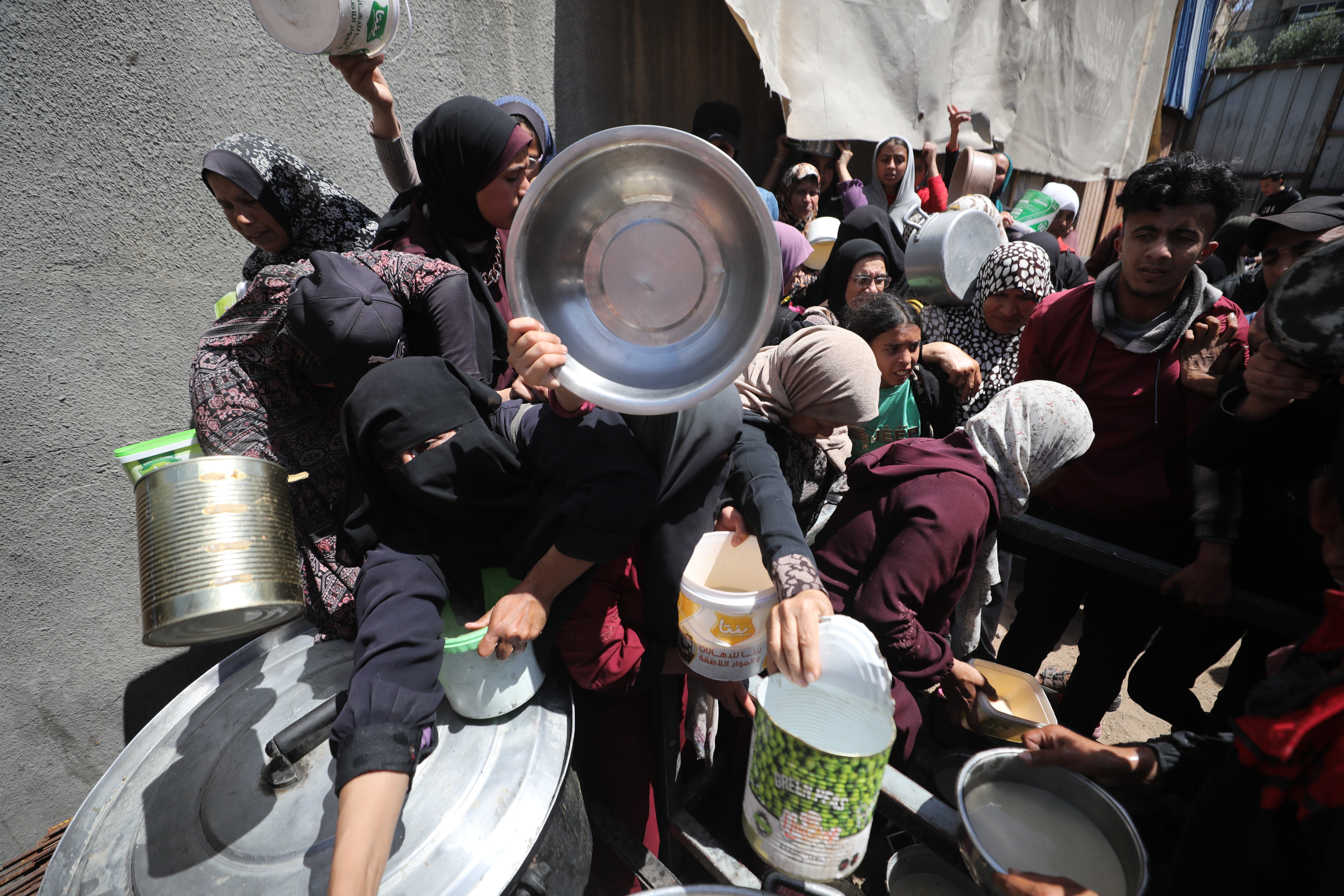 وجوه أنهكها الجو ع والتعب.. نازحون يتكدسون أمام التكية في مخيم النصيرات