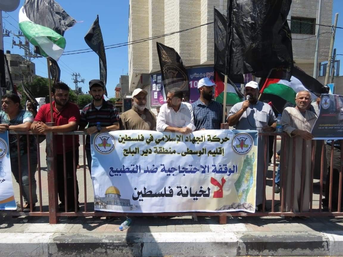 ورفع المشاركون خلال الوقفة التي نظمتها حركة الجهاد الإسلامي، لافتات يعبرون فيها عن رفضهم للتطبيع مع الاحتلال، معتبرين أن ذلك يشكل طعنة وخيانة لفلسطين.