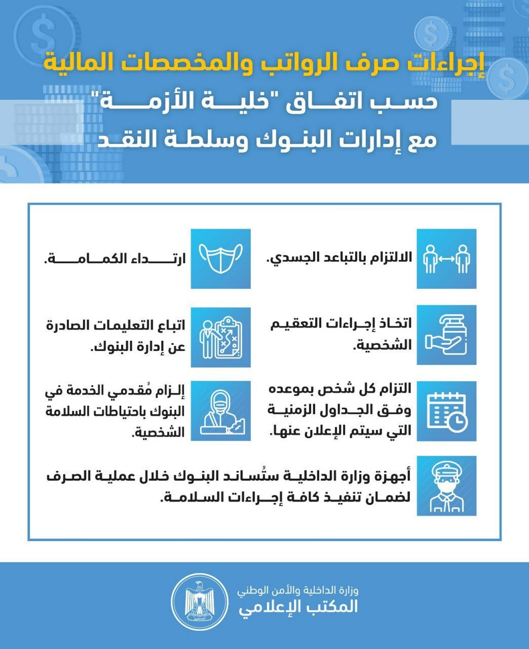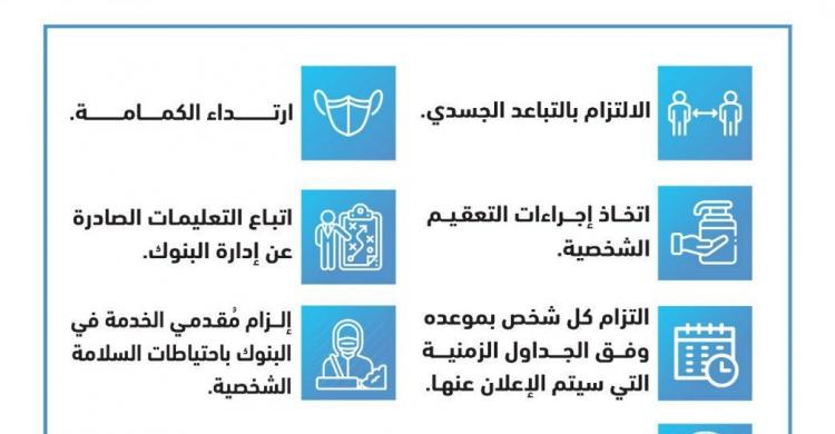 وشددت الداخلية على ضرورة الالتزام بالتباعد الجسدي، وارتداء الكمامة، واتخاذ إجراءات التعقيم الشخصية، واتباع التعليمات الصادرة عن إدارات البنوك.