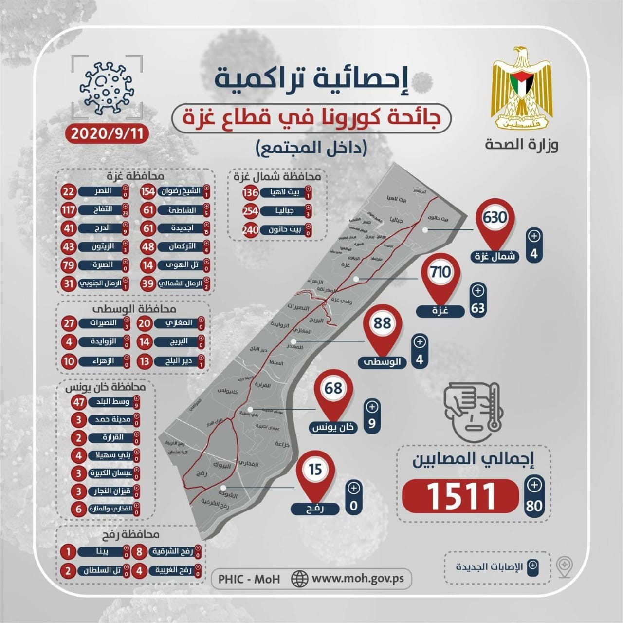 في المرتبة الثالثة جاءت محافظتا الشمال والوسطى، ففي محافظة شمال غزة سجلت 4 إصابات فقط خلال 24 ساعة الماضية بانخفاض كبير جداً عن أمس، وهذا أيضاً أقل رقم تسجله المحافظة منذ تفشي الوباء، حيث كانت قد سجلت أمس 113 إصابة، لتصبح الحصيلة الإجمالية 630 إصابة.