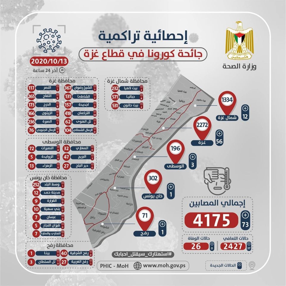 ومحافظة رفح شهدت تراجع 6 حالات عن أمس حيث كانت قد سجلت 7 إصابات ويرتفع بذلك العدد في رفح إلى 71 إصابة.