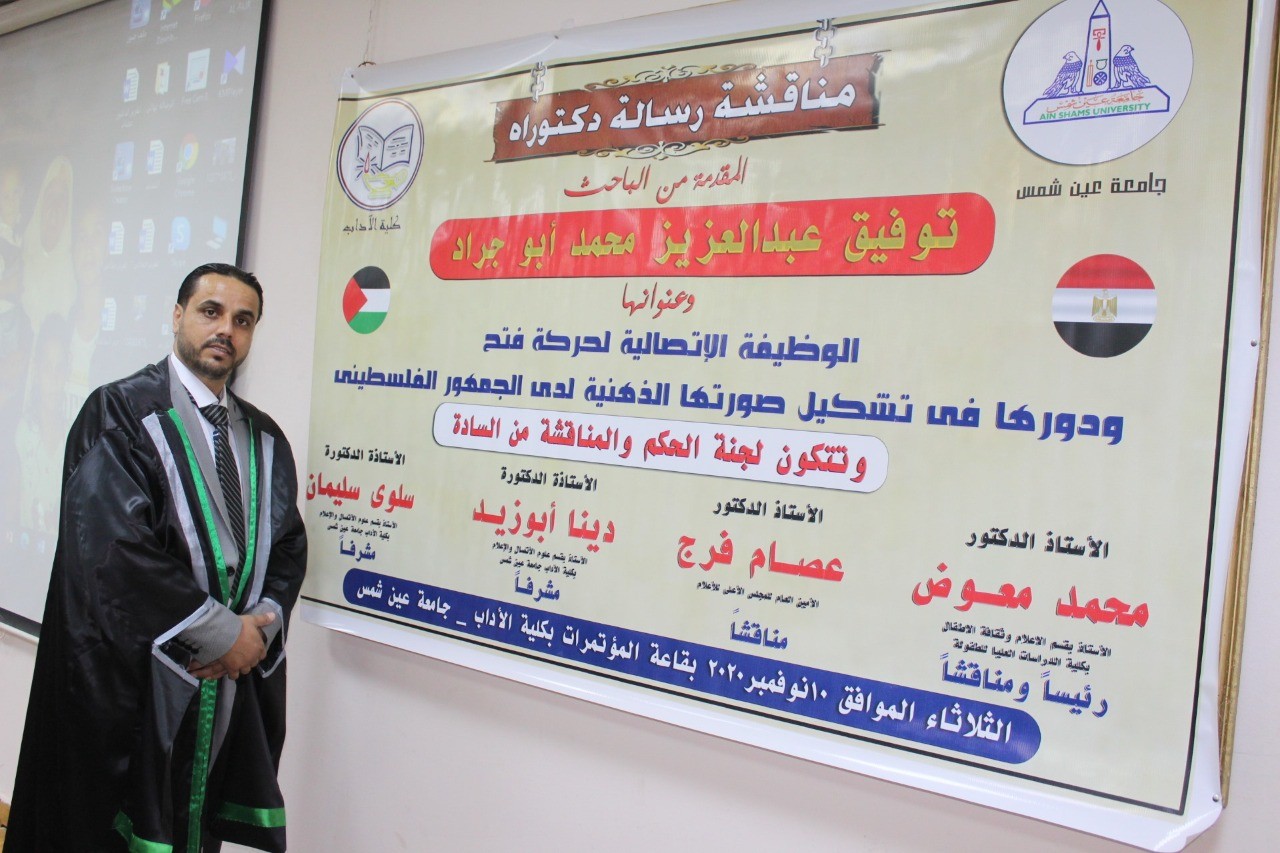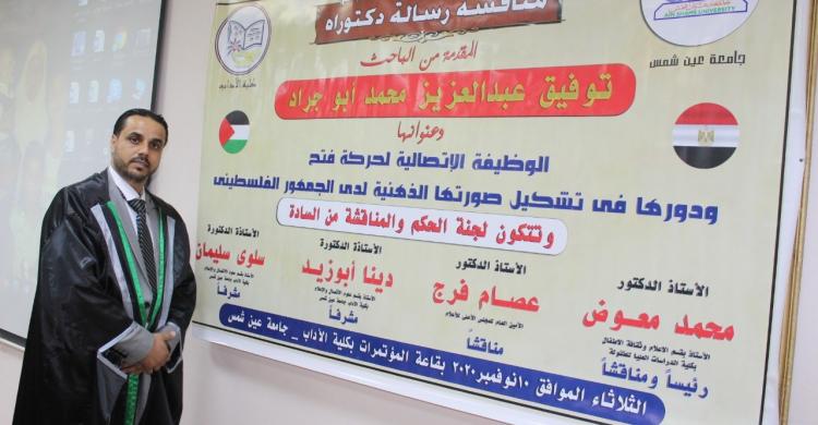 منحت جامعة عين شمس بالقاهرة، الباحث والصحفي، توفيق أبو جراد، درجة الدكتوراه في علوم الاتصال والاعلام بعد مناقشة أطروحته التي حملت عنوان "الوظيفة الاتصالية لحركة فتح ودورها في تشكيل صورتها الذهنية لدى الجمهور الفلسطيني" وحضر المناقشة نخبة من القيادات الفلسطينية وقيادات حركة فتح في مصر.