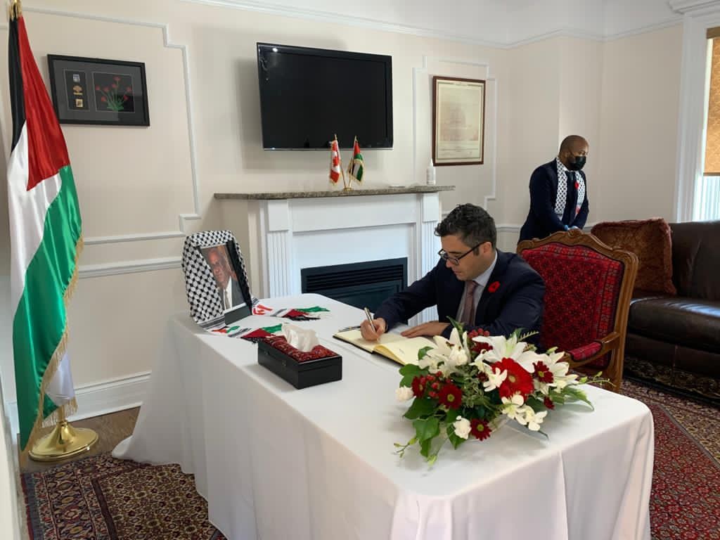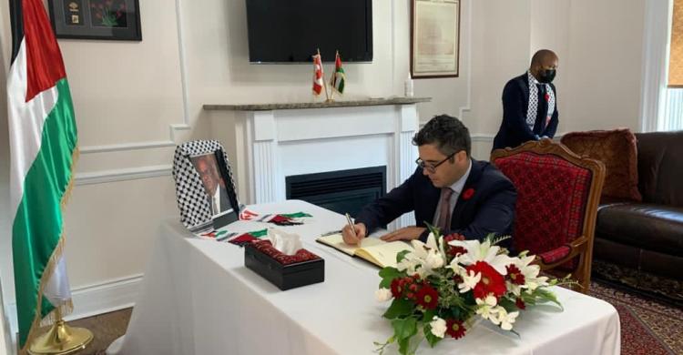 وتوافد سفراء ورؤساء البعثات الدبلوماسية العربية والأجنبية المعتمدين في كندا، وممثلي المنظمات العربية وشخصيات اعتبارية، إلى مقر المفوضية ودونوا في سجل العزاء الخاص، تعازي حكوماتهم، للشعب الفلسطيني، وعائلة الفقيد، بوفاة عريقات، الذي كرس حياته مدافعا عن القضية الفلسطينية، وإيجاد حل عادل للفلسطينيين، مؤكدين أن وفاته خسارة كبيرة لعملية السلام.