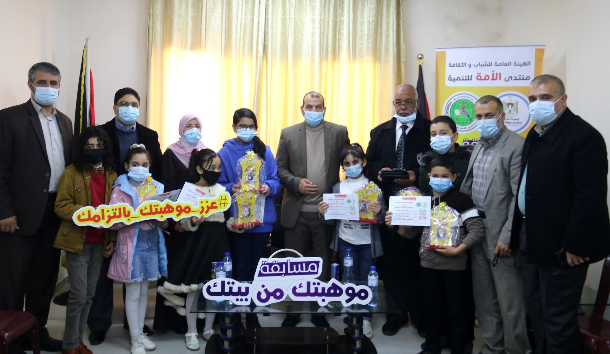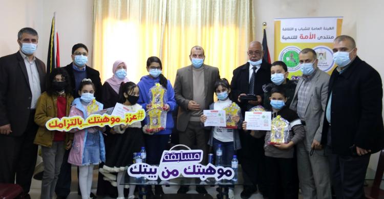 كرمت الهيئة العامة للشباب والثقافة، ومنتدى الأمة للتنمية، اليوم الإثنين، الأطفال العشرة الفائزين في الأسبوع الأول من مسابقة موهبتك من بيتك، والتي تهدف إلى إبراز مواهب الأطفال وإبداعاتهم خلال فترة الحجر الصحي بسبب جائحة "كورونا".