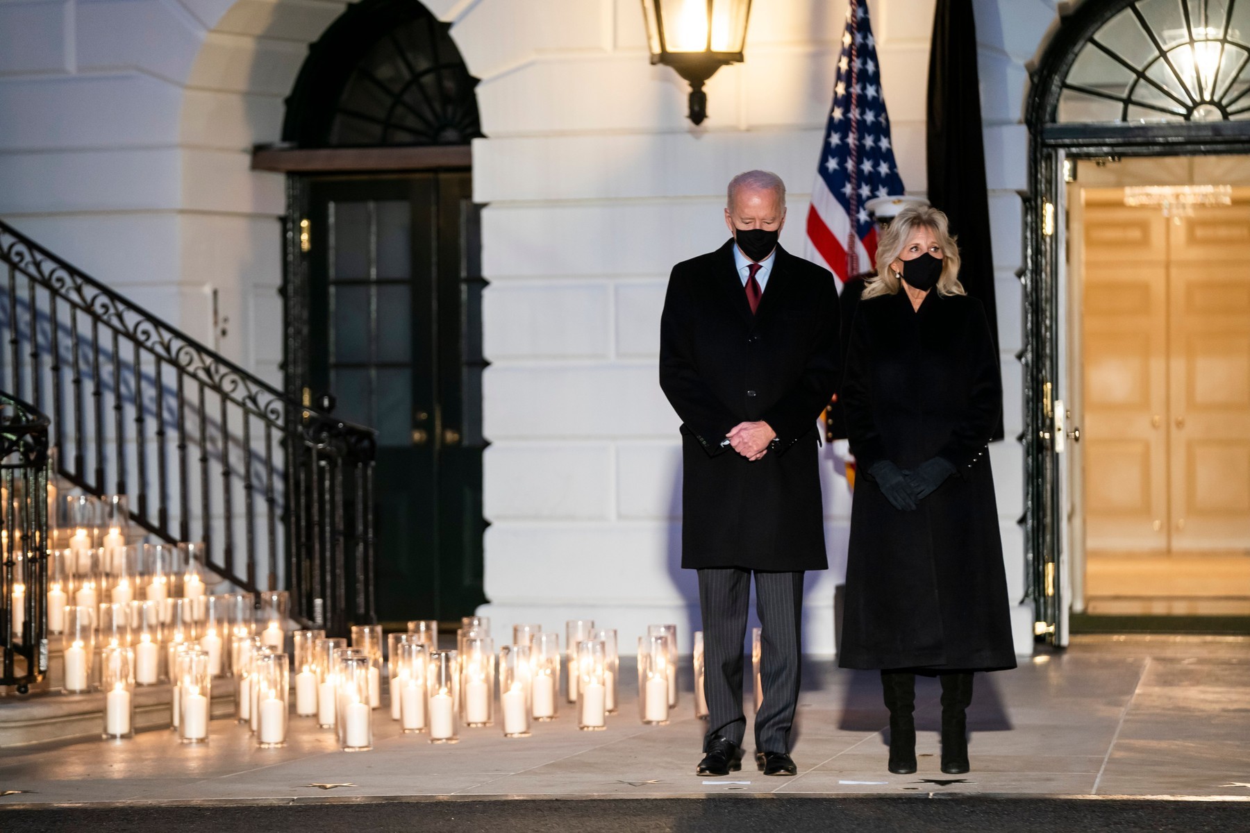وبعدما ألقى الرئيس بايدن خطابه خرج برفقة زوجته جيل ونائبته كامالا هاريس وزوجها دوغ إيمهوف إلى الحديقة الجنوبية للبيت الأبيض، حيث وقفوا دقيقة صمت حدادا على الأرواح التي أزهقها الفيروس، والتي تمثلت بـ 500 شمعة أضيئت خلفهم.