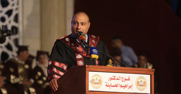 وتلى د. أحمد جواد الوادية برتوكول الجامعة لتخريج الفوج الثاني والثالث "فوج الفقيد الدكتور ابراهيم الحساينة" خلال حفل تخريج الطلبة مساء اليوم السبت 7 اغسطس 2021 في أرض جامعة الإسراء بمدينة الزهراء وسط قطاع غزة.