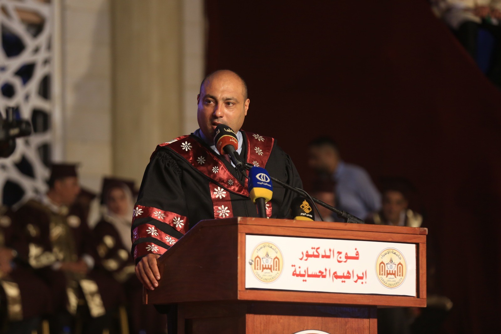 "بعد الاطلاع على نتائج الامتحانات في جامعة الإسراء والتحقق من استيفاء عدد من طلبة الجامعة جميع متطلبات التخرج في درجتي البكالوريوس والدبلوم المتوسط في الاختصاصات التي تقدمها الجامعة واستنادًا إلى القوانين والانظمة المعمول بها في الجامعة فقد قرر مجلس ادارة الجامعة منح هؤلاء الطلبة الدرجات العلمية التي يستحقونها حسب اختصاصهم، ارجو التكرم من سعادة رئيس الجامعة باستكمال مراسم تخرجهم على بركة الله".