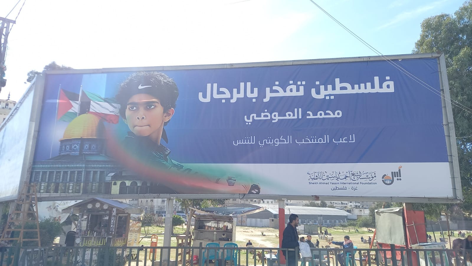 وكتب على الصورة العملاقة التي عُلقت على مفترق السرايا "فلسطين تفخر بالرجال محمد العوضي لاعب المنتخب الكويتي للتنس" يُشار إلى أن اللاعب العوضي يبلغ من العمر (14 عامًا).