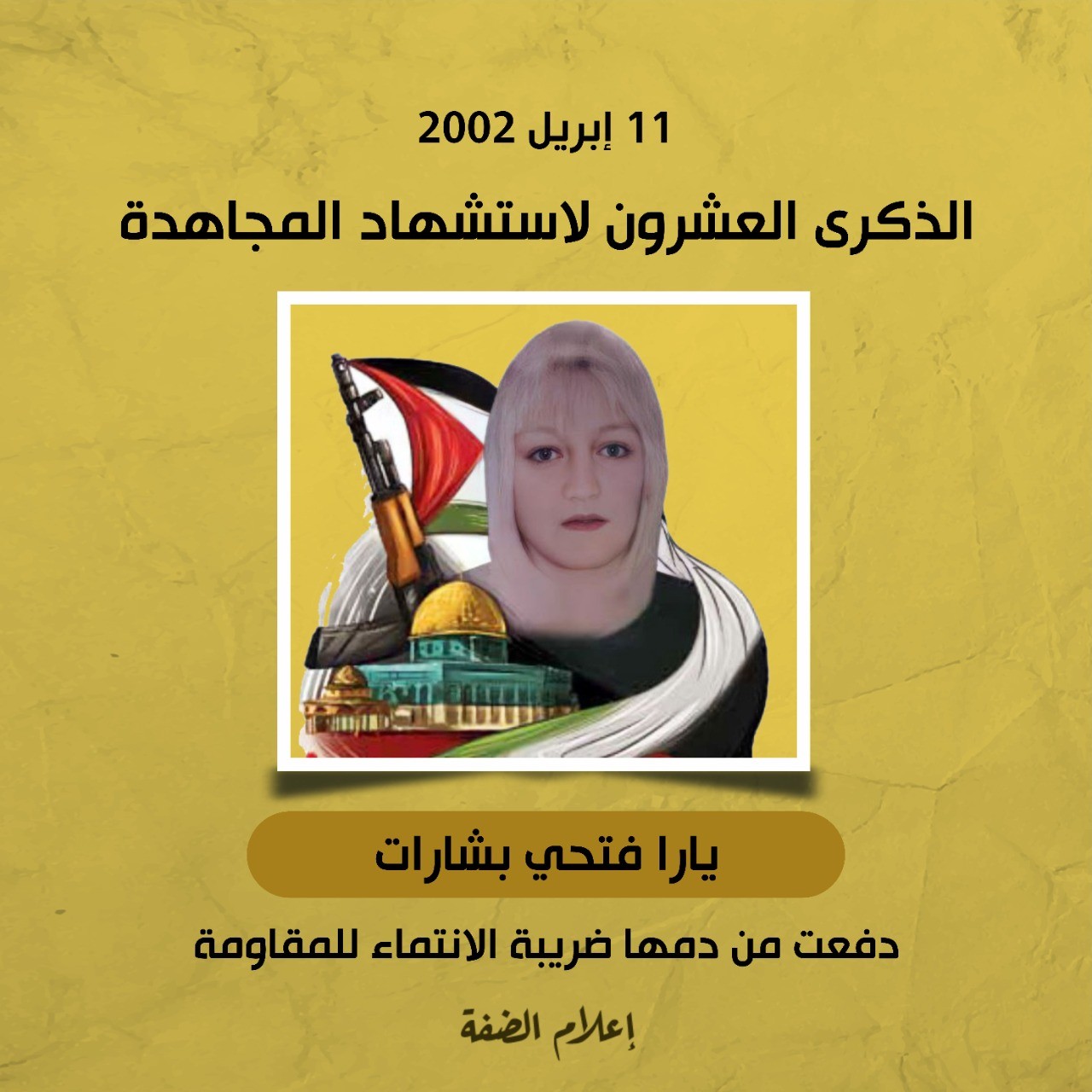 يوافق اليوم الذكرى العشرون، لاستشهاد المجاهدة يارا بشارات، التي وقفت إلى جانب زوجها القيادي المحرر رايق بشارات، رغم الملاحقة والاعتقال، فكانت له سنداً وعوناً في كل أوقاته وأيامه، حتى ارتقت شهيدة، فيما هو يعاني ألم الجسد وألم الفقد.