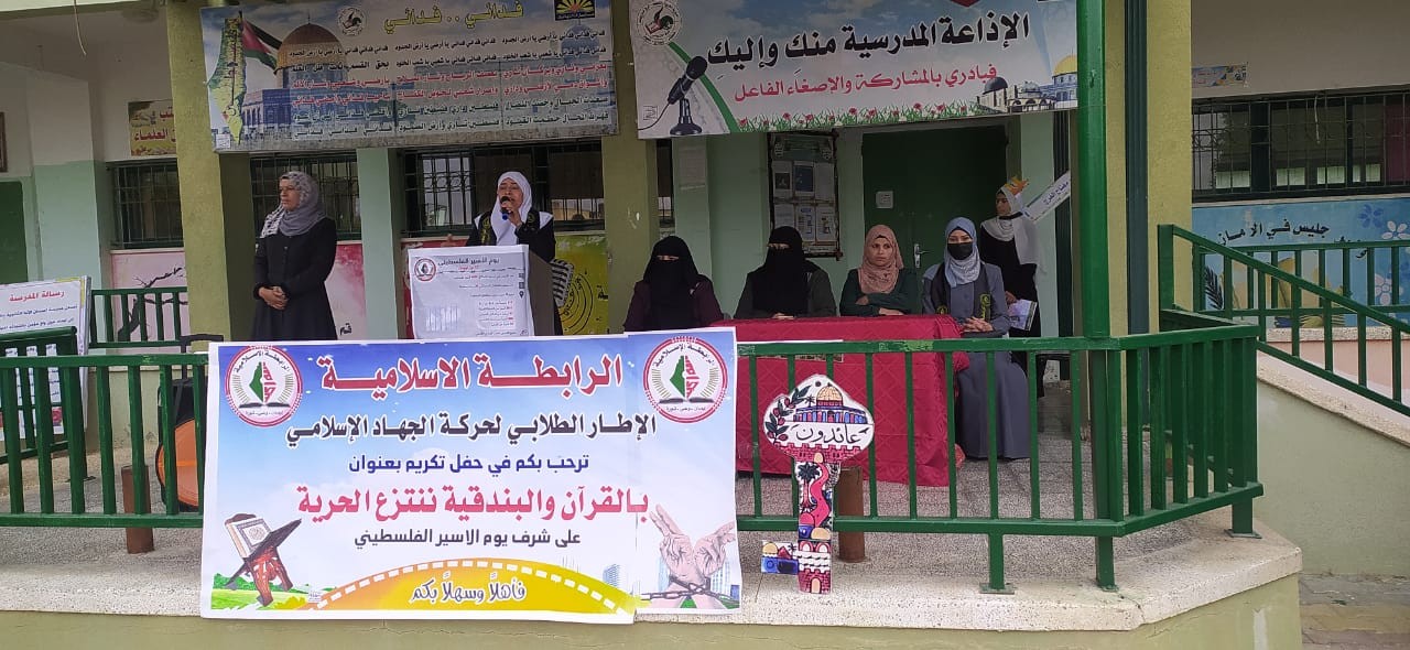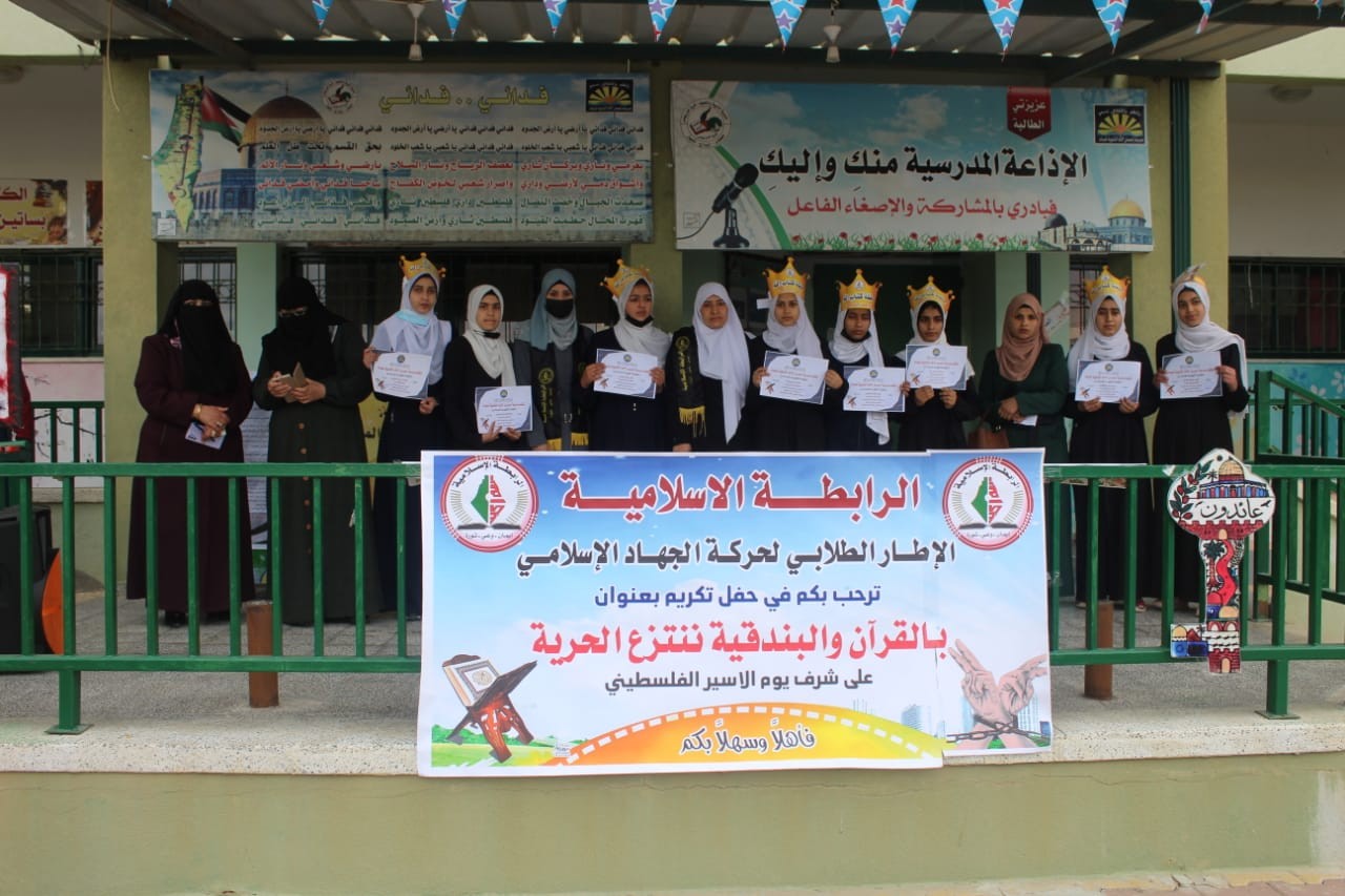 كرمت الرابطة الإسلامية الإطار الطلابي لحركة الجهاد الإسلامي في فلسطين ثلة من حافظات كتاب الله خلال حفل بعنوان "قرآني وبندقيتي رمز حريتي" أقامته صباح اليوم على شرف يوم الأسير الفلسطيني في مدرسة إحسان الأغا الثانوية للبنات بمحافظة خانيونس.