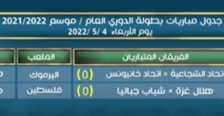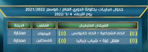 يقدم لكم "شمس نيوز " متابعة خاصة لحظة بلحظة لمبارتي هلال غزة و شباب جباليا ، و اتحاد الشجاعية و اتحاد خانيونس اليوم الأربعاء 4-5-2022 في افتتاح منافسات الأسبوع ال_16 من بطولة الدوري الغزي الممتاز .
