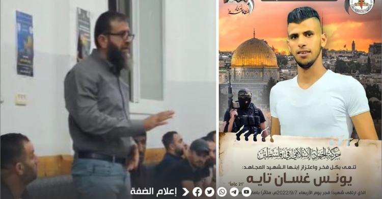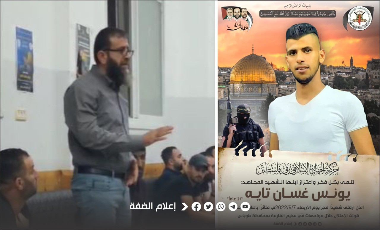 يشار إلى أن حركة الجهاد الإسلامي زفت شهيدها المجاهد يونس غسان التايه (21 عامًا) الذي ارتقى خلال مواجهات مع قوات الاحتلال في مخيم الفارعة بمحافظة طوباس يوم الأربعاء الماضي 7 سبتمبر 2022م.