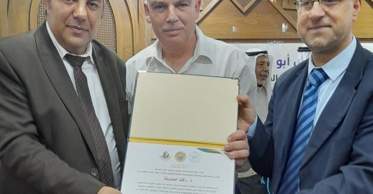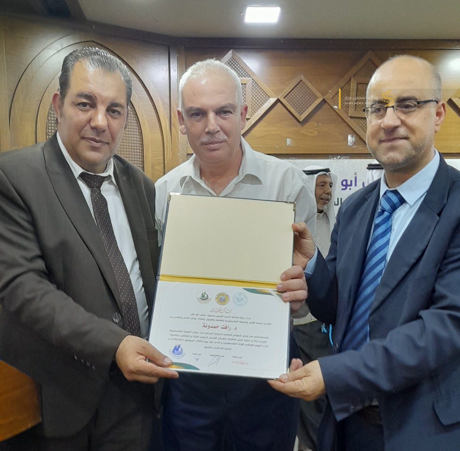 جامعة فلسطين والهيئة الفلسطينية للثقافة تكرمان الباحث الدكتور حمدونة فى أعقاب تحكيم بحث الثقافة والفنون فى السجون
