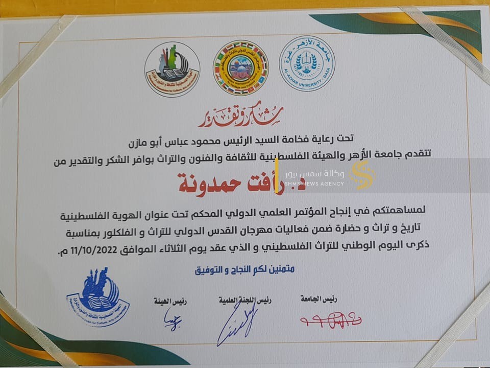 قامت جامعة فلسطين والهيئة الفلسطينية للثقافة والفنون والتراث اليوم الأربعاء بتكريم الأسير المحرر والباحث فى قضايا الأسرى الدكتور رأفت حمدونة لمساهمته فى انجاح المؤتمر العلمى الدولى المحكم الذى أقيم بجامعة الأزهر تحت رعاية السيد الرئيس محمود عباس أبو مازن تحت عنوان الهوية الفلسطينية تاريخ وتراث وحضارة، وخلال التكريم تم الاعلان عن الفائزين بلقب سفير فلسطين للتراث و الفلكلور.
