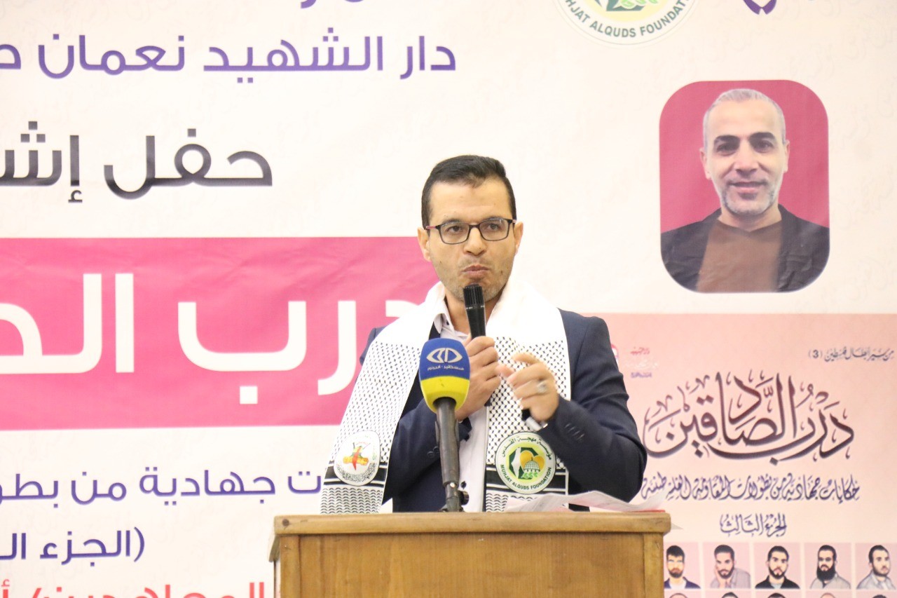 وفي كلمة الأسرى قال الأستاذ علي العامودي مسؤول الدائرة الإعلامية في حركة حماس كل التحية لإخوة القيد أسرانا في سجون الاحتلال الذين مازالوا يخطون لنا درب الصادقين نلتقي اليوم في حضرة البطولة والجهاد والمقاومة من أسرانا الأبطال نلتقي في درب الصادقين للأسير محمد والأسير أنور أصحاب هذا الإنجاز وأسرانا جميعًا في هذه اليوم كل التحية والاعتزاز.