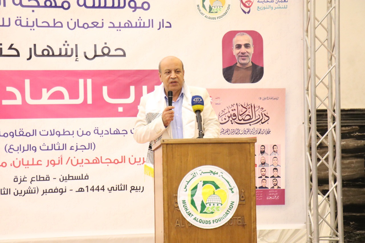 نظمت مؤسسة مهجة القدس للشهداء والأسرى والجرحى اليوم الخميس حفل إشهار كتاب درب الصادقين – حكايات جهادية من بطولات المقاومة الفلسطينية للأسيرين المجاهدين أنور عليان، ومحمد أبو طبيخ والصادر عن دار الشهيد نعمان طحاينة للنشر والتوزيع، في قاعة فندق الجزيرة على شاطئ بحر غزة، بحضور العشرات من قادة فصائل العمل الوطني والإسلامي وممثلي الهيئات الوطنية والشعبية المختلفة.