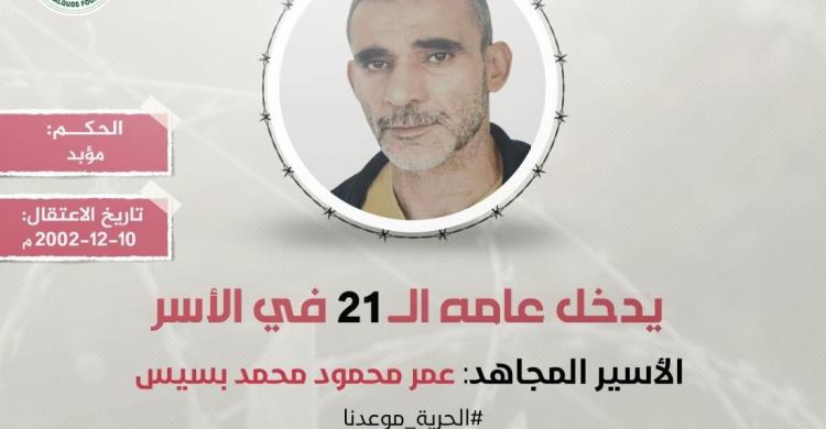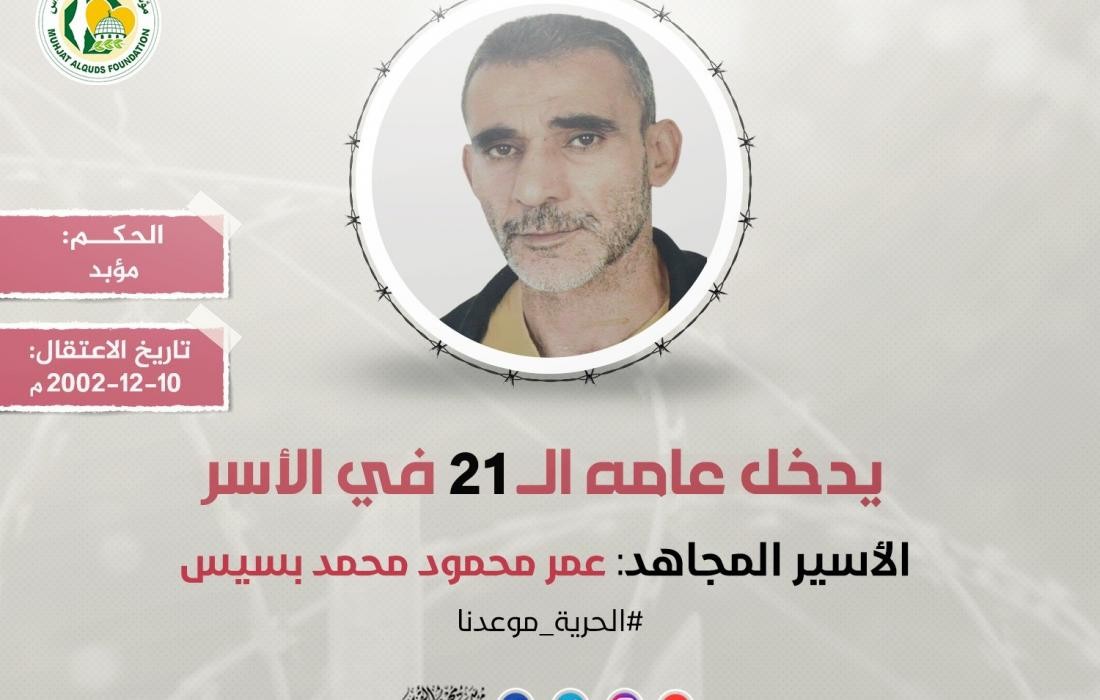 أفادت مؤسسة مهجة القدس للشهداء والأسرى والجرحى، أن الأسير المجاهد عمر محمود محمد بسيس (57 عامًا) من بلدة شويكة بمحافظة طولكرم بالضفة المحتلة أنهى عشرين عامًا على التوالي في الأسر ويدخل اليوم عامه الحادي والعشرين في سجون الاحتلال الصهيوني.