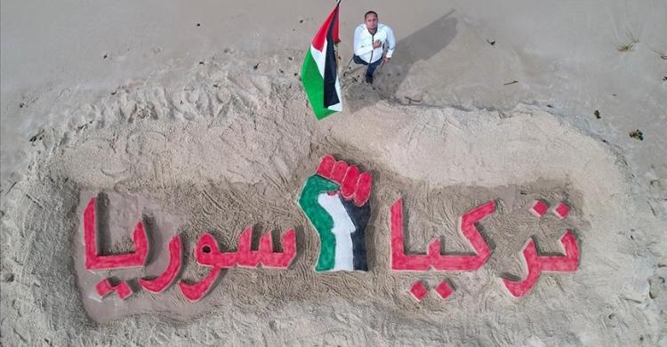 وتضمنت اللوحة التي رسمها الفنان محمد طوطح باستخدام رمال الشاطئ والألوان مجسمات لعلمي تركيا وسوريا، توسطتهما قبضة يد مرسوم عليها علم فلسطين.