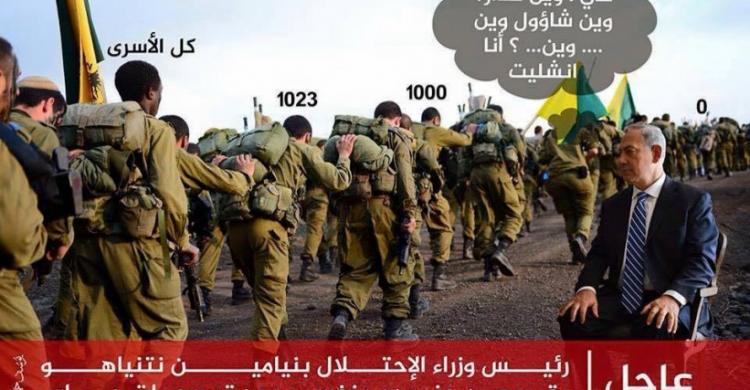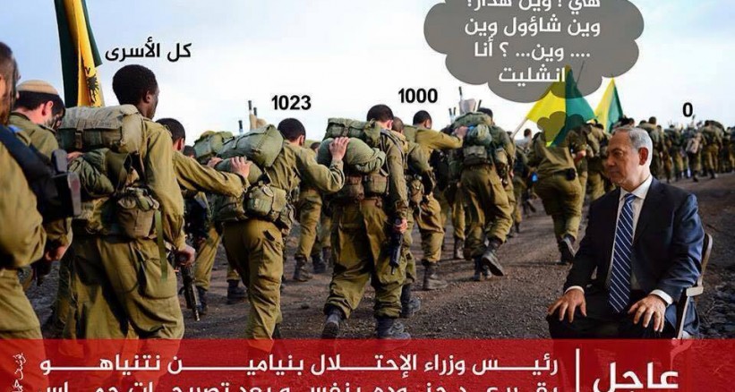 وظهرت صورة نتنياهو يجلس على كرسي أمام طابور من جنوده وهم عائدون من حرب غزة يقوم بعملية العدد ويتساءل اين ارون جولدن (وهما الجنديان المعلن عن فقدهما بغزة).