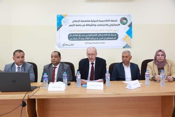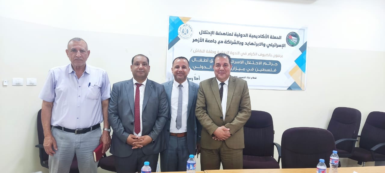 عقدت الحملة الاكاديمية الدولية لمناهضة الاحتلال والابرتهايد بالتعاون مع جامعة الازهر ندوة حوارية " طاولة مستديرة" لمجموعة من النخب القانونية والاكاديمية بعنوان ((جرائم الاحتلال الاسرائيلي بحق اطفال فلسطين في ميزان القانون الدولي)).