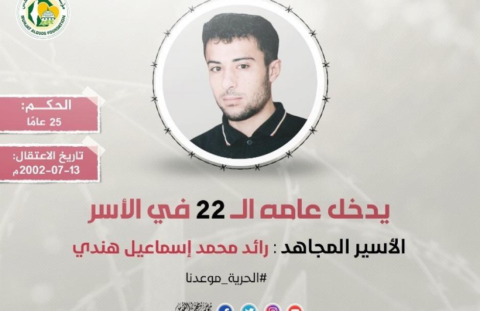 أفادت مؤسسة مهجة القدس للشهداء والأسرى والجرحى؛ أن الأسير المجاهد رائد محمد إسماعيل هندي (43 عامًا)؛ من بلدة تل بمحافظة نابلس بالضفة المحتلة، أنهى احدى وعشرين عامًا على التوالي في الأسر ويدخل اليوم عامه الثاني والعشرين في سجون الاحتلال الصهيوني.