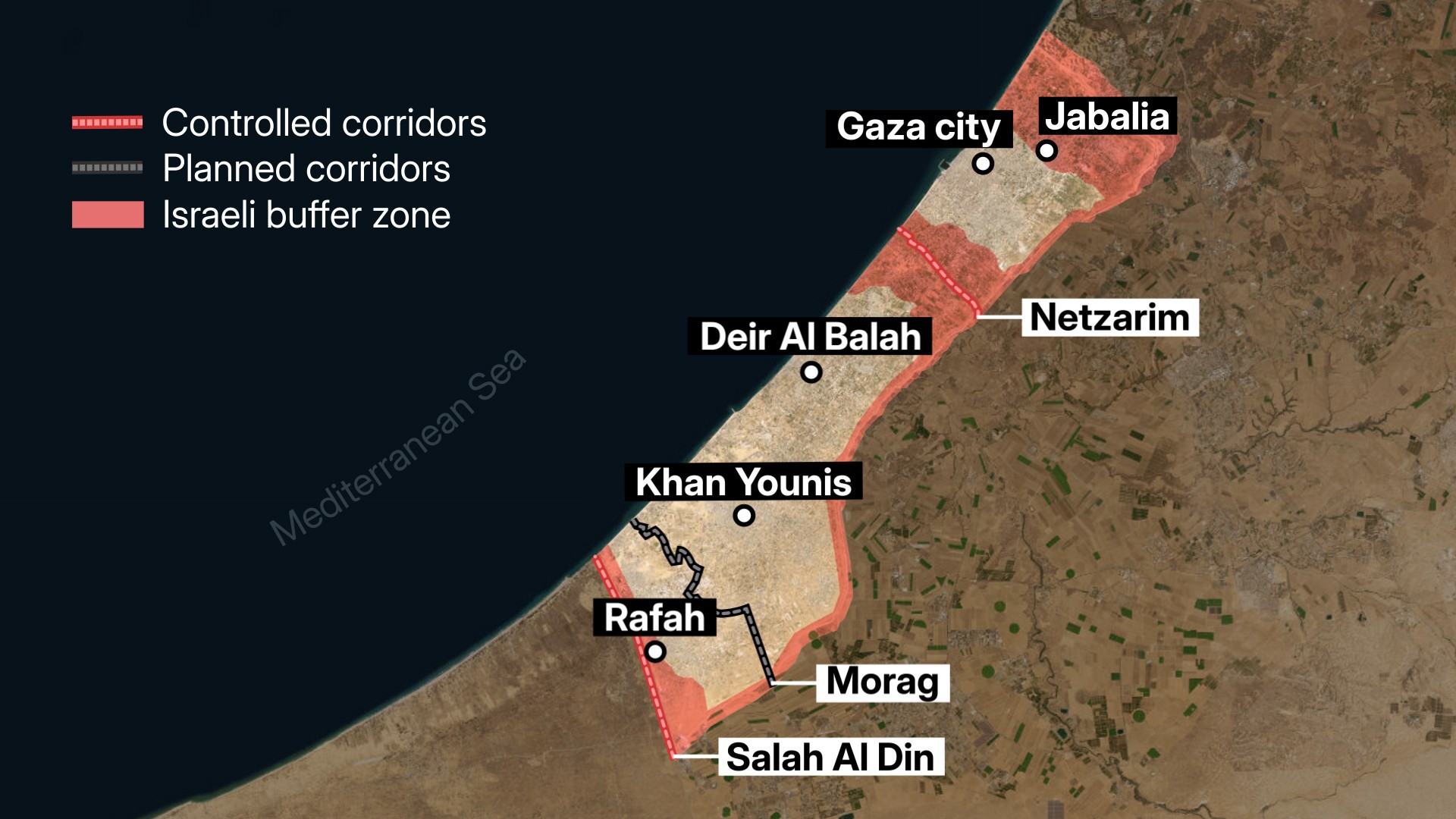 "محور موراج"، يمتد من الشرق إلى الغرب بين مدينتي رفح وخان يونس جنوب قطاع غزة، في خطوة تعد استراتيجية لتعزيز السيطرة العسكرية الإسرائيلية على المنطقة.