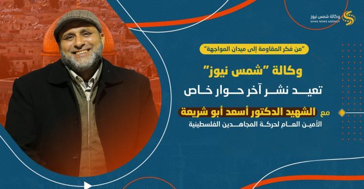 وتُعيد "وكالة "شمس نيوز" إحياء ونشر أبرز النقاط التي جاءت خلال الحوار الخاص، الذي يُعتبر وثيقة فكرية مقاومة، سيما أن مضامينه لا تزال حاضرة، وتحمل في ظلالها رؤية استراتيجية، وتحليلاً عميقاً، واستشرافاً دقيقاً لمآلات الصراع مع الاحتلال؛ وفاءً لدماء الشهيد الدكتور أبو شريعة، وتوثيقاً لرؤيته، وتأريخاً لموقف رجلٍ صاغ كلماته بمداد العزم، وعاش واسشتهد مؤمناً بعدالة قضيته، وحتمية المواجهة، وخيار المقاومة حتى تحرير الأرض والإنسان.