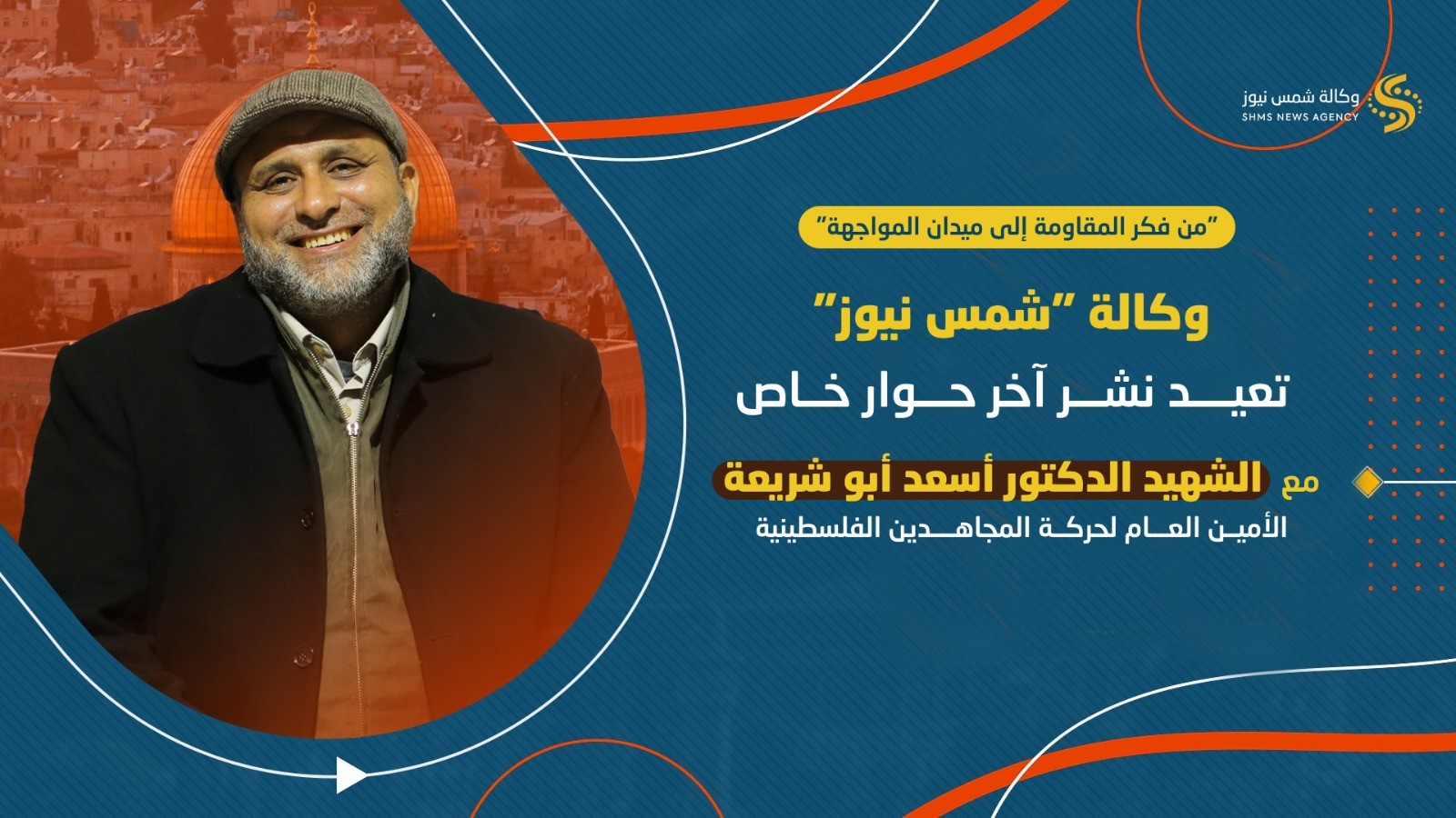 وكان الزميل الصحفي الشهيد محمد أبو شريعة مدير التحرير السابق في وكالة "شمس نيوز"، قد أجرى حواراً خاصاً ومفصلاً، قبل عامين، مع الأمين العام د. أسعد أبو شريعة؛ لمناسبة الانطلاقة الـ22 لحركة المجاهدين، وقد حمل في طياته ملامح مشروعه المقاوم، ورؤيته السياسية، ومواقفه الثابتة من وحدة الصف، وطبيعة العلاقة بين فصائل المقاومة الفلسطينية ومحور المقاومة، والمشروع الأمريكي الصهيوني في المنطقة.