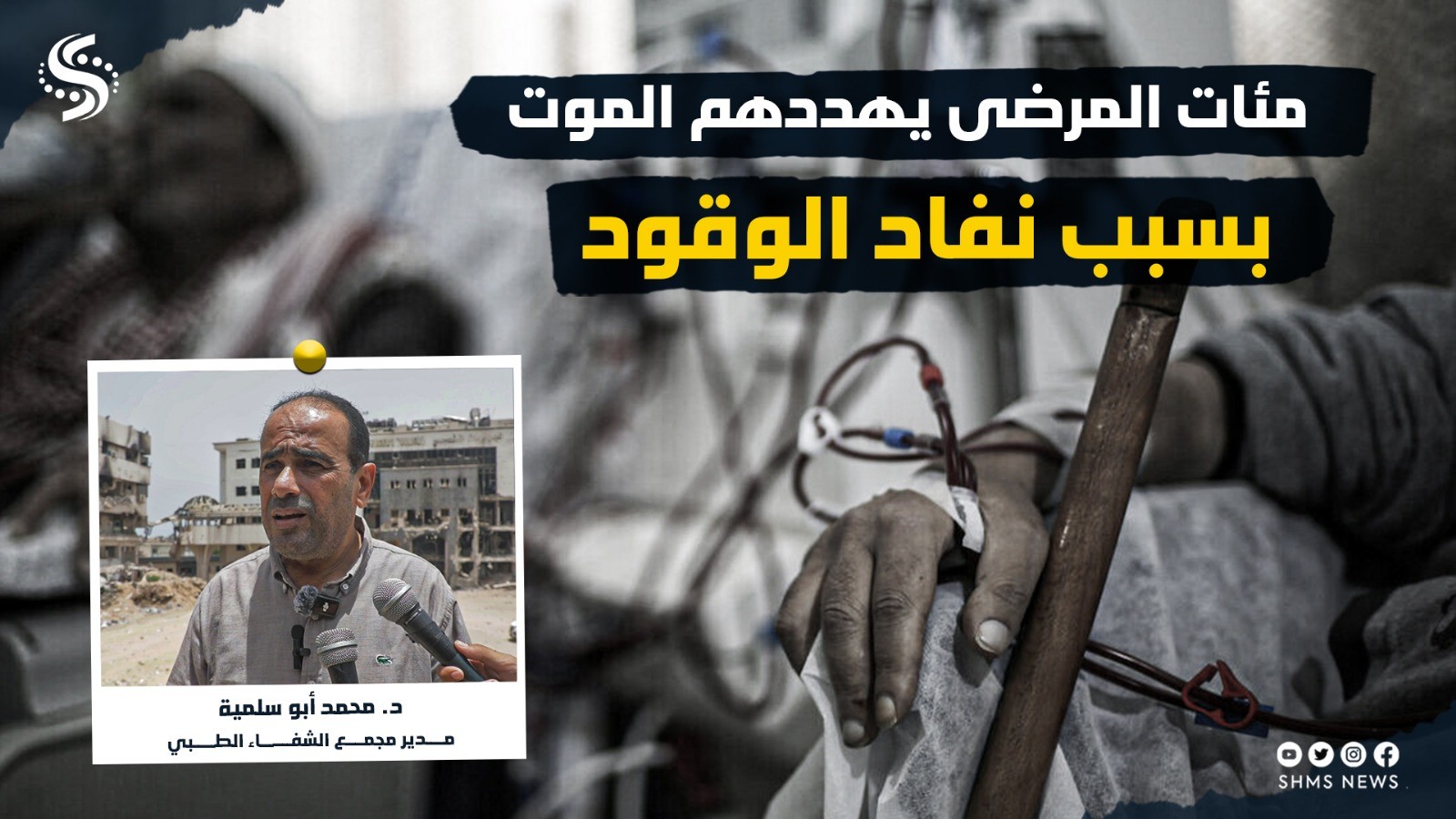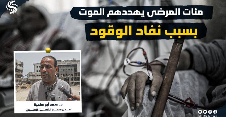 وأوضح "أبو سلمية" في تصريح خاص لمراسل "شمس نيوز" (يوم أمس الثلاثاء 01/07/2025م)، أن المجمع اضطر لإيقاف قسم غسيل الكلى، ما أدى إلى حرمان أكثر من 350 مريضاً من جلسات الغسيل الحيوية، مبيناً أن الكميات المحدودة المتبقية من الوقود يجري استخدامها فقط لتشغيل أقسام العناية المركزة والعمليات بشكل محدود.
