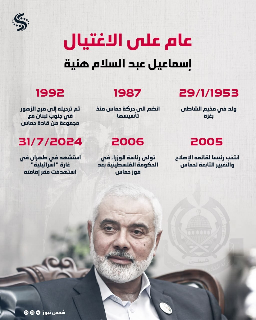 في فجر الأربعاء 31 يوليو/تموز 2024 أعلنت حركة حماس اغتيال القائد إسماعيل هنية في العاصمة الإيرانية طهران.
