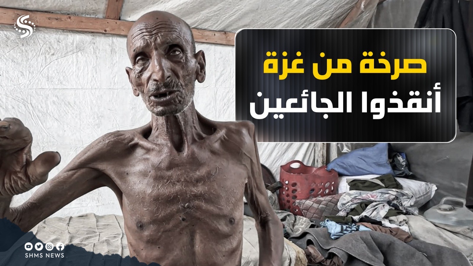 المسن عصفور (85 عاما) نازحٌ من منطقة عبسان شرق خانيونس، ويعيل 6 أبناء، بات جسده شاهداً حياً على المجاعة التي تضرب قطاع غزة، اذ بانت عظام جسده بشكل جلي وتحول لهيكل عظمي، وخلال نحو 5 شهور من الحصار المشددة فقد المسن سليم 30 كيلو جرام من وزنه، إذ كان يزن 70 كيلو أنا يبلغ 40 كيلو فقط.