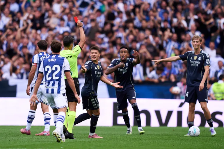 لجنة الحكام الإسبانية تعترف بخطأ ضد ريال مدريد بعد طرد هويسين، خلال فوز الريال (2-1) خارج أرضه على ريال سوسيداد في الدوري الإسباني لكرة القدم.