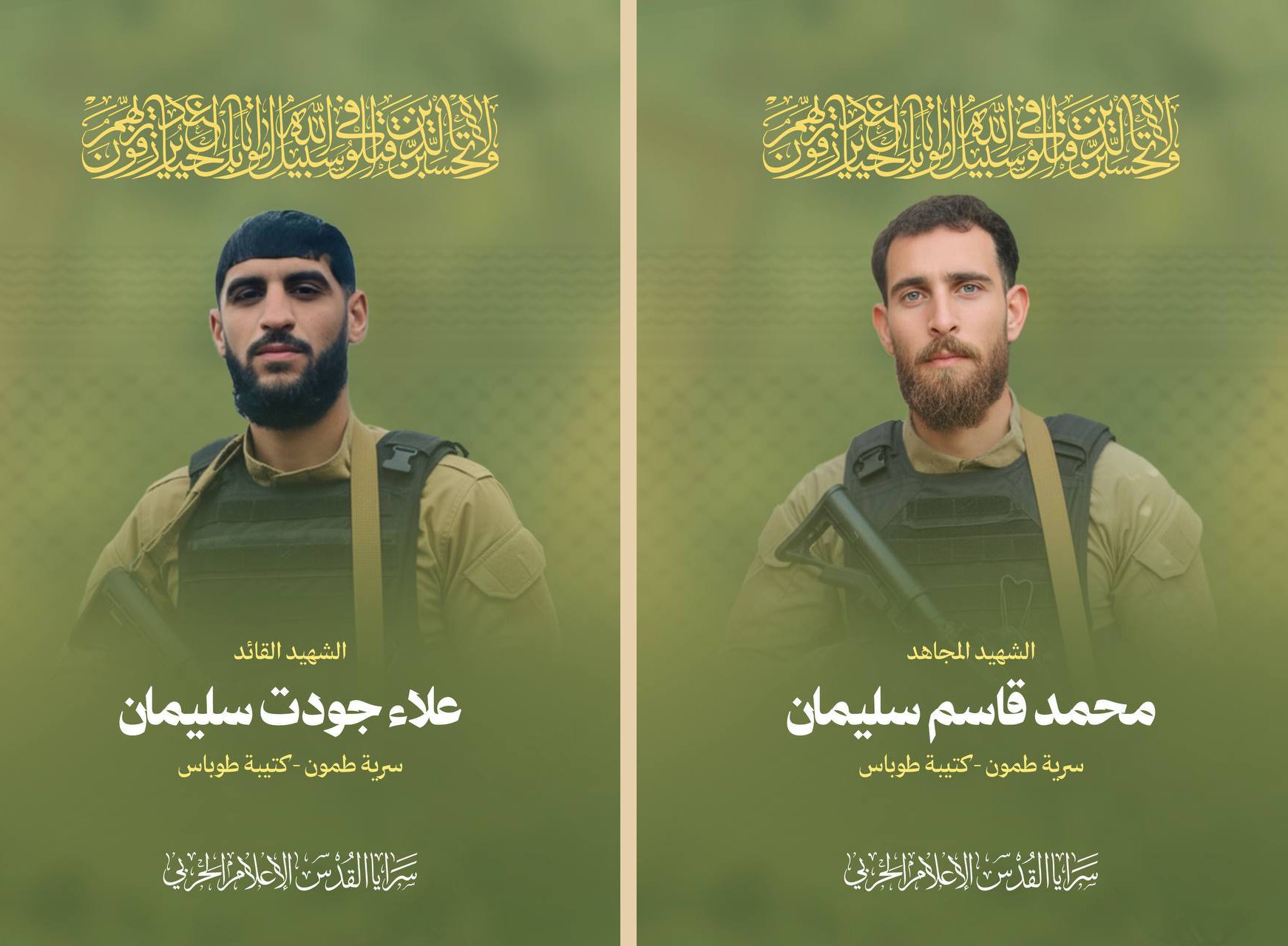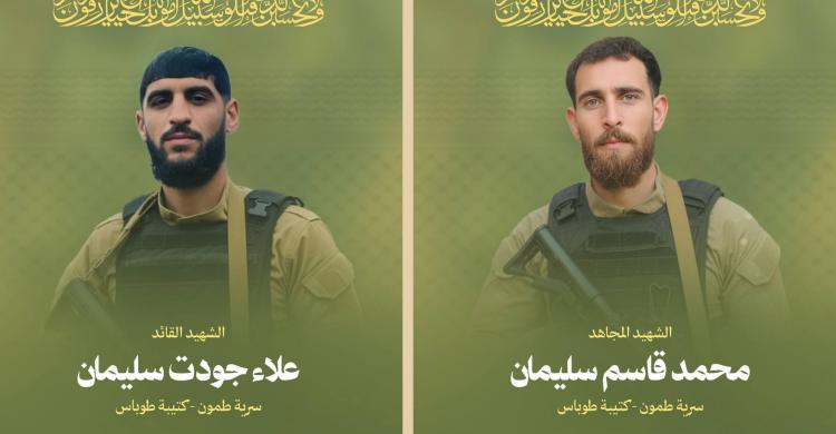 وأشارت إلى أنهما ارتقيا بعد خوضهم إشتباك مسلح لعدة ساعات مع قوات العدو التي حاصرتهم بمنزل في بلدة طمون شمالي الضفة الغربية المحتلة.