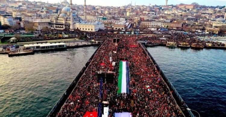 تجمّع نحو 520 ألف شخص، اليوم الخميس، في أول أيام 2026، عند جسر غلطة في إسطنبول، للمشاركة في مسيرة حاشدة تضامنًا مع فلسطين.