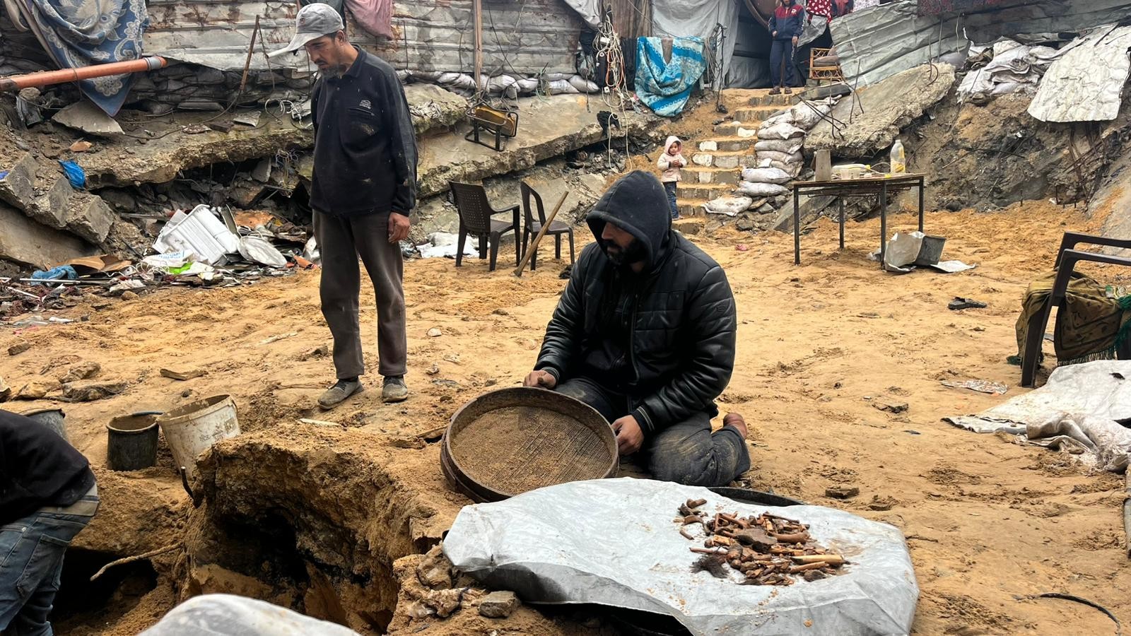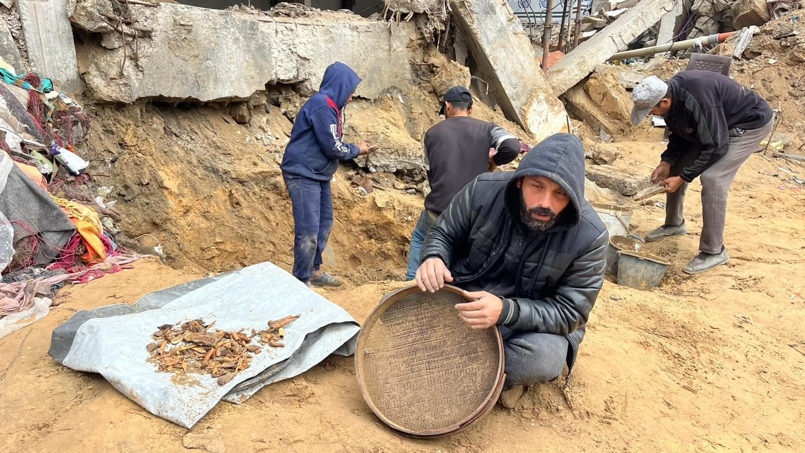 يُمسك محمود بكلتا يديه غربال -مُنخل- مليئ بالرمال، وبسرعة يخض الغربال يمنة ويسرة لإزالة الشوائب، يكرر محمود المشهد منذ أكثر من 100 يوم دون كلل أو ملل، محاولا البحث على رفات زوجته وأطفاله الستة -بينهم جنين- تحت رمال منزله المدمر.