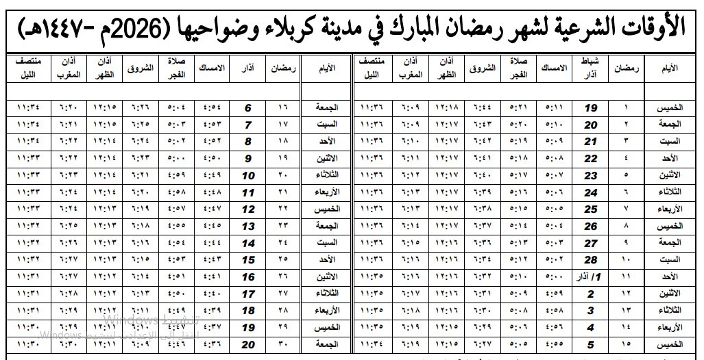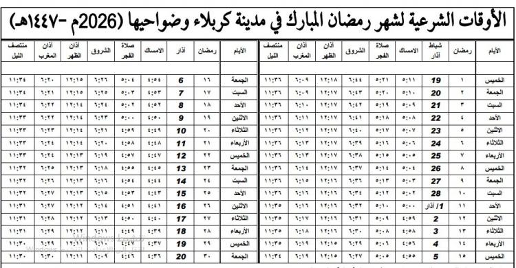 وتُعد إمساكية رمضان 2026 في العراق من أكثر الموضوعات بحثًا عبر محركات البحث، حيث يعتمد عليها الصائمون لمعرفة توقيت أذان الفجر (الإمساك)، وأذان المغرب (الإفطار)، إضافة إلى مواقيت الظهرين والعشاءين طوال أيام الشهر الفضيل.
