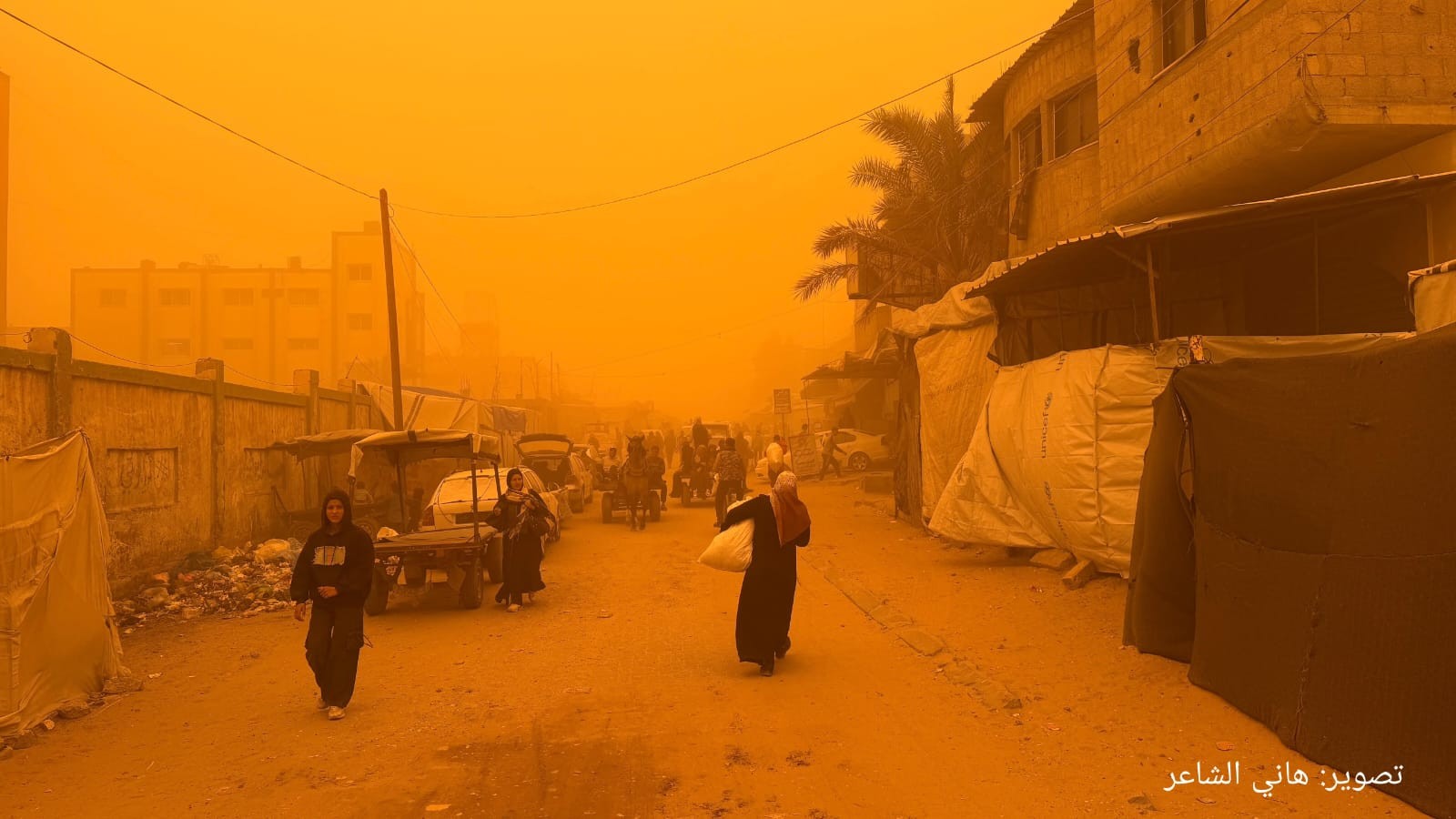 ضربت عاصفة رملية، اليوم السبت، قطاع غزة، متسببة بزيادة معاناة آلاف النازحين الذين يقيمون داخل الخيام في قطاع غزة، حيث تسللت الرمال إلى الخيام المهترئة وسط ظروف إنسانية قاسية يعيشها النازحون منذ أشهر.