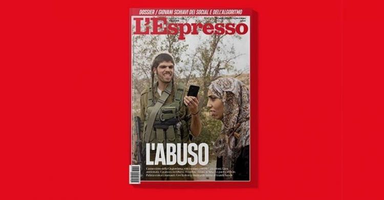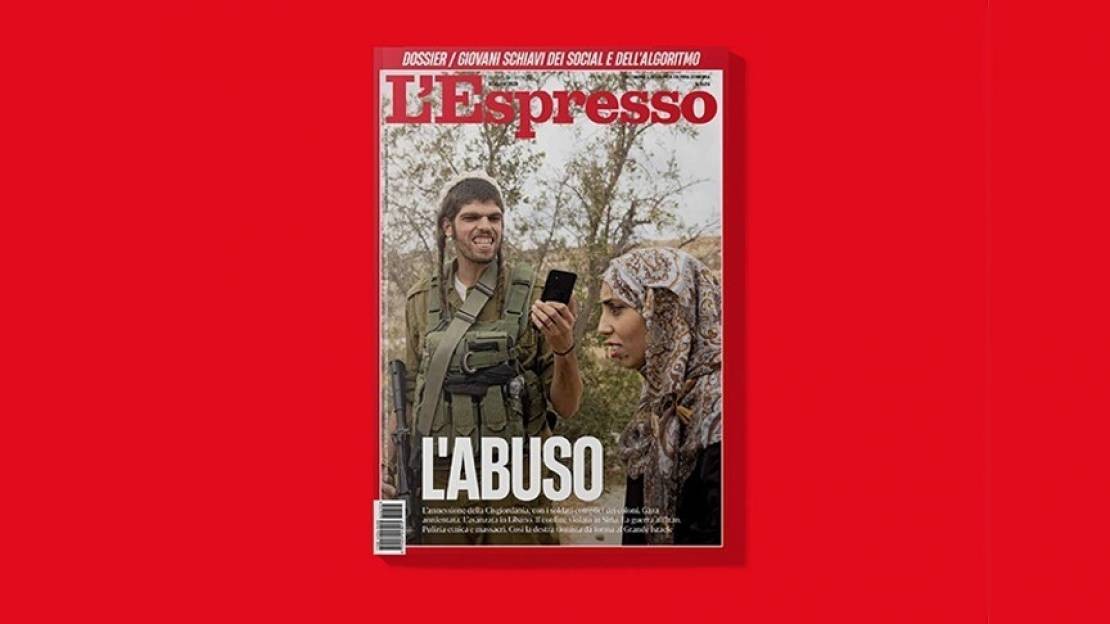 وتحت عنوان "الاعتداء" (L’abuso)، نشرت المجلة غلافا عليه صورة جندي بجيش الاحتلال مسلح يعتمر "كيباه" (قلنسوة يرتديها الصهاينة المتشددون دينيا)، وهو يصوّر بهاتفه امرأة فلسطينية بعدوانية تظهرها تعبيرات وجهه.