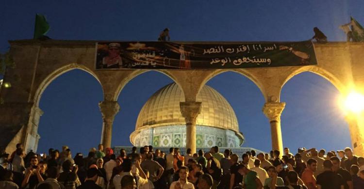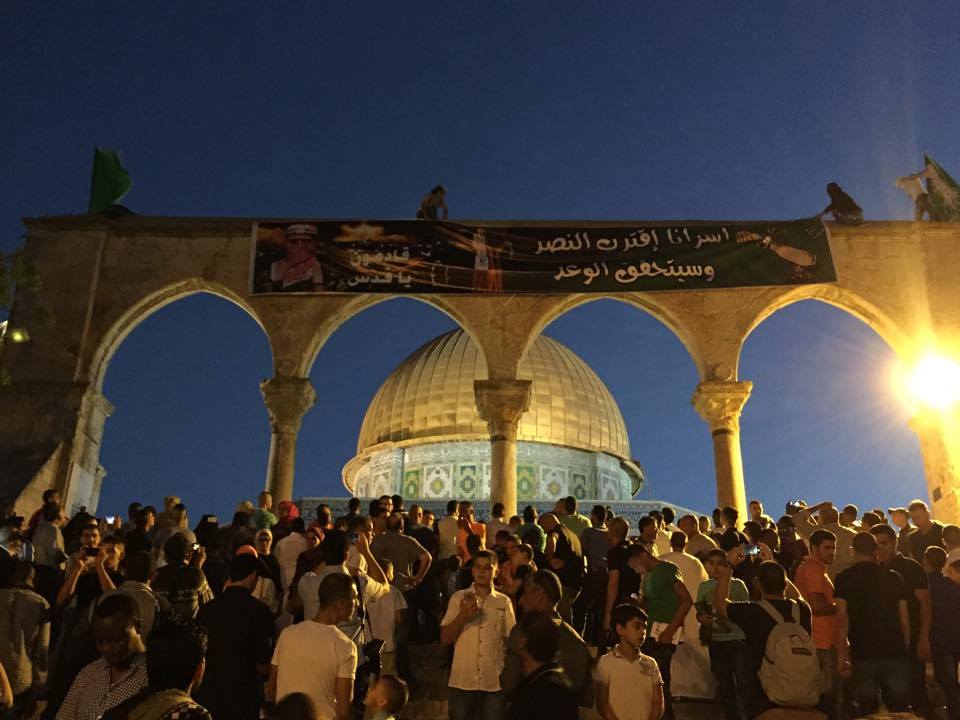 أدى الآلاف من أبناء الشعب الفلسطيني المسلم صلاة العيد السعيد في باحات المسجد الأقصى المبارك صباح اليوم الجمعة، فيما رفع ملثمون يافطة كبيرة بالقرب من المسجد حملت صورة الناطق بإسم كتائب القسام "أبو عبيدة".
