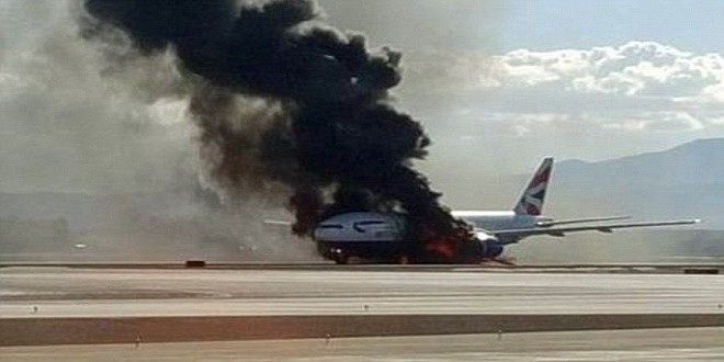 اشتعلت النار في محرك طائرة تابعة للخطوط الجوية البريطانية في لاس فيغاس بينما كانت تستعد للإقلاع إلى لندن، الثلاثاء، مما دفع الطيار لإلغاء الاقلاع.