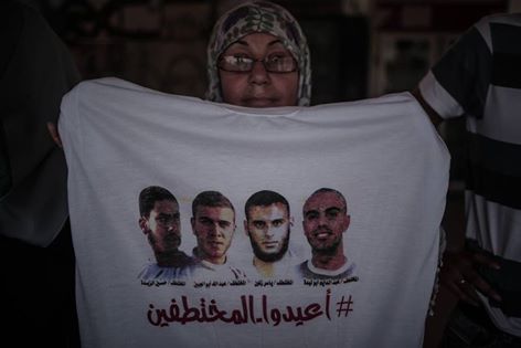 ورفع المشاركون في التظاهرة التي دعا لها "التجمع الشعبي للتضامن مع مختطفي معبر رفح"، لافتات تحمل صور المختطفين الأربعة، كتب على بعضها:" أعيدوا المختطفين".