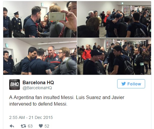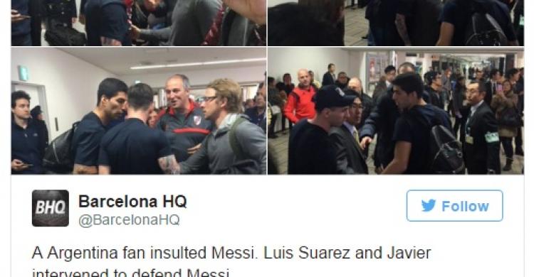ووفقا لصحيفة (آس) الاسبانية فإن جماهير ريفر بليت وجهت اهانات لفظية إلى البرغوث الارجنتيني قبل أن يقوم احد المشجعين الغاضبين بالبصق على وجه ميسي، الذي رد عليه بلكمة استدعت تدخل المدرب لويس انريكي ولويس سواريز وخافيير ماسكيرانو وبعض الحاضرين في المكان من أجل تطويق الشجار.